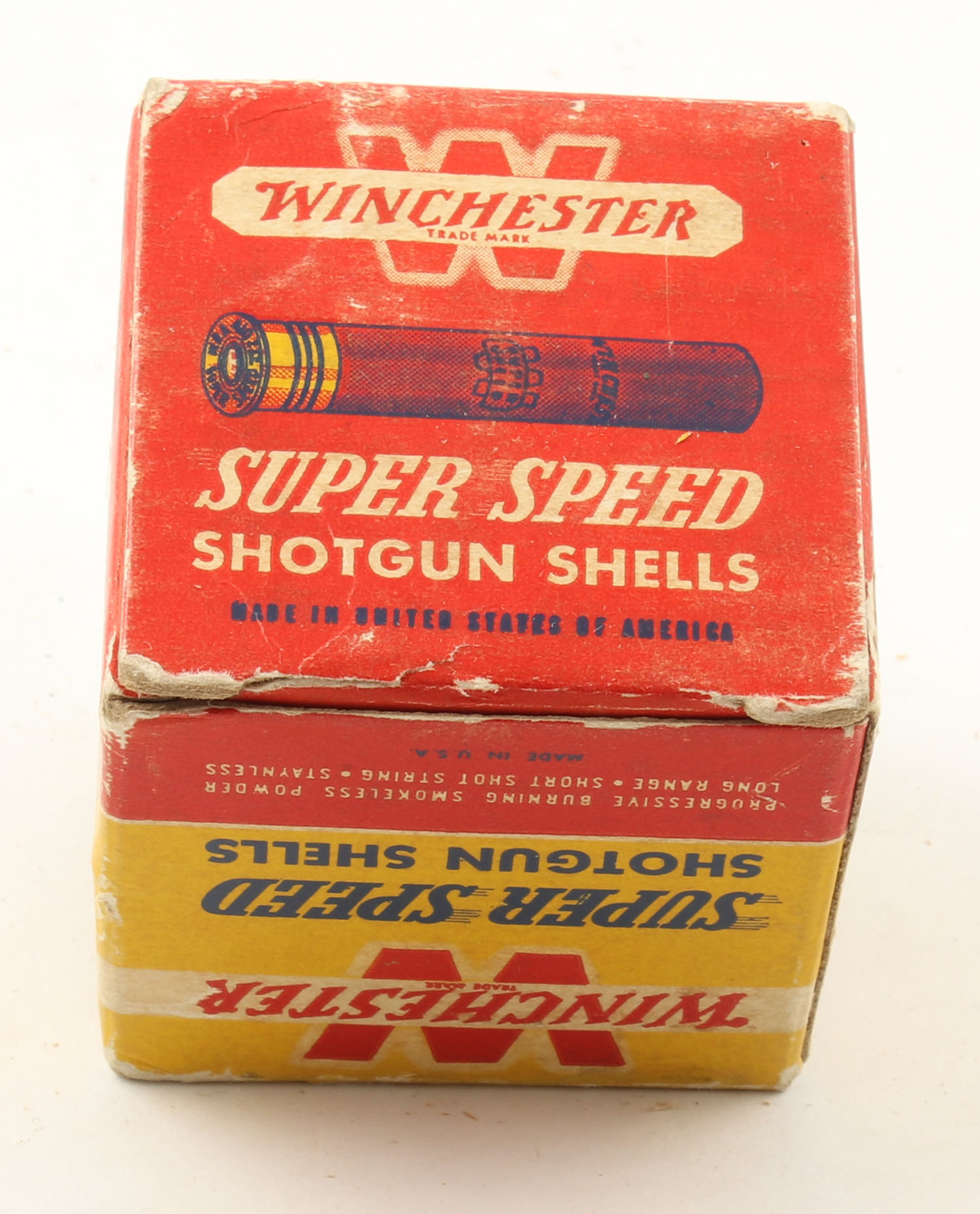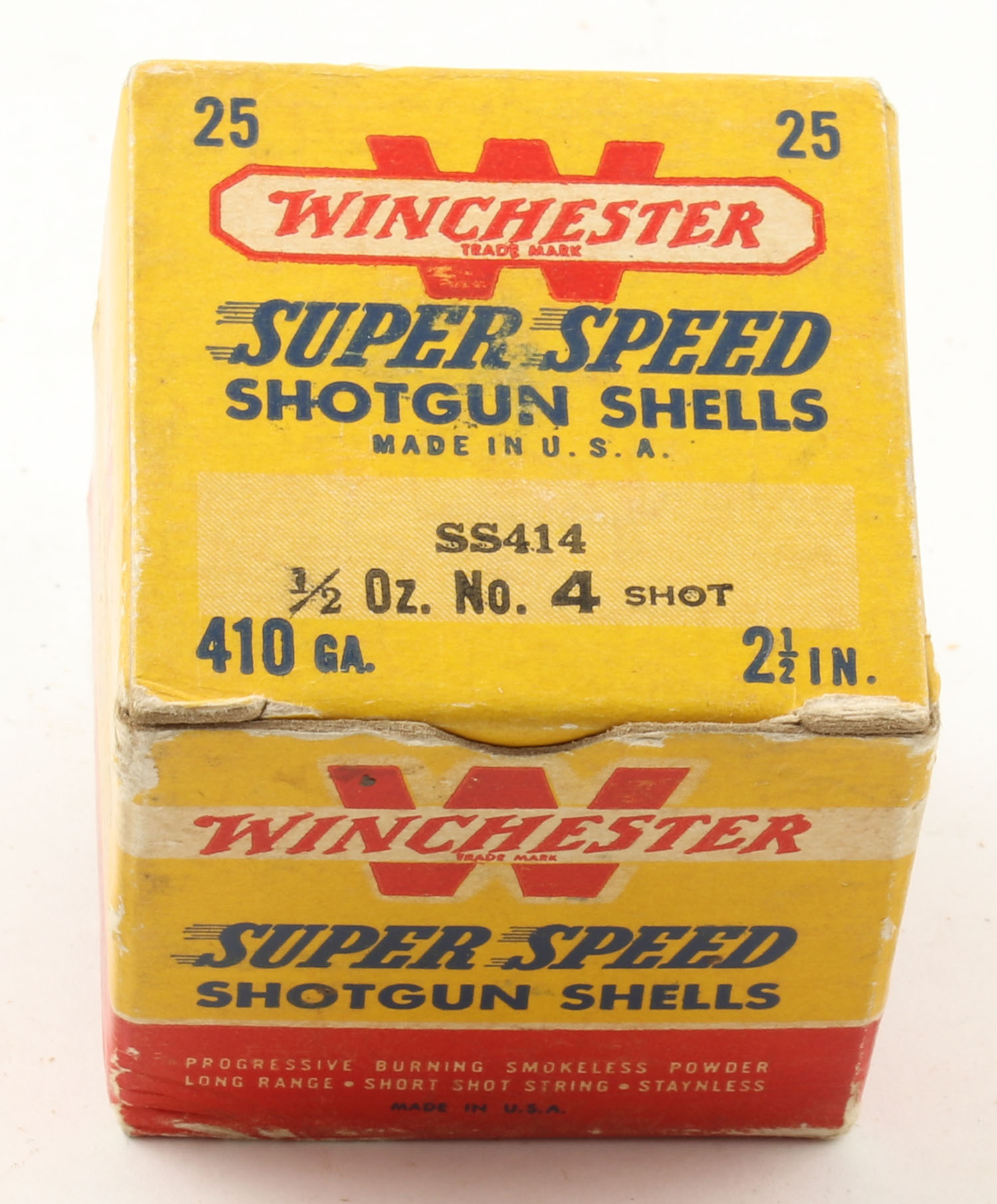 Winchester, Super Speed, 410ga., 2 1/2'', 1pc., Full, shot size 4, red, black and yellow box, box is solid with excellent color, paper shells are excellent. Grade: Excellent - Value: 10 to 40