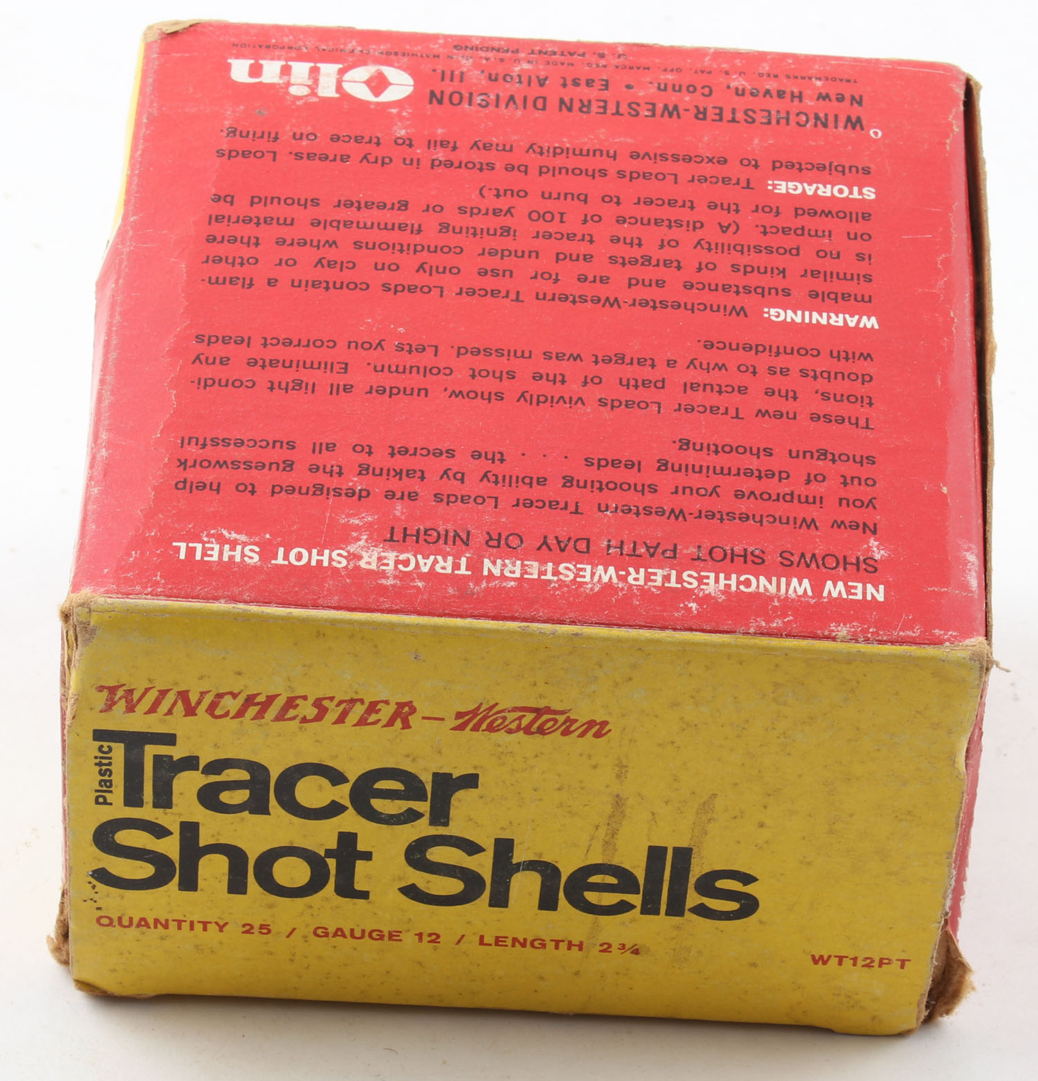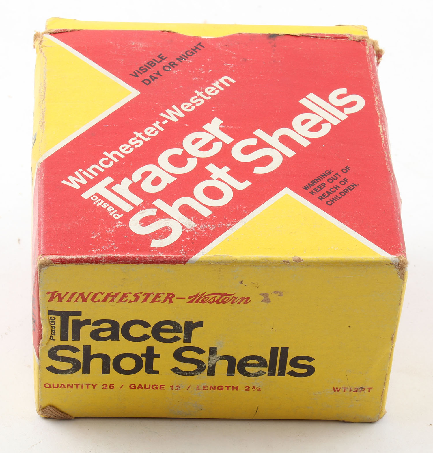 Winchester-Western, Tracer Shot Shells, 12ga., 1pc., Partial 22rds, VISIBLE DAY OR NIGHT, red, yellow & white box, box has scuffing with corner wear, plastic shells are excellent. Grade: Very Good - Value: 10 to 40