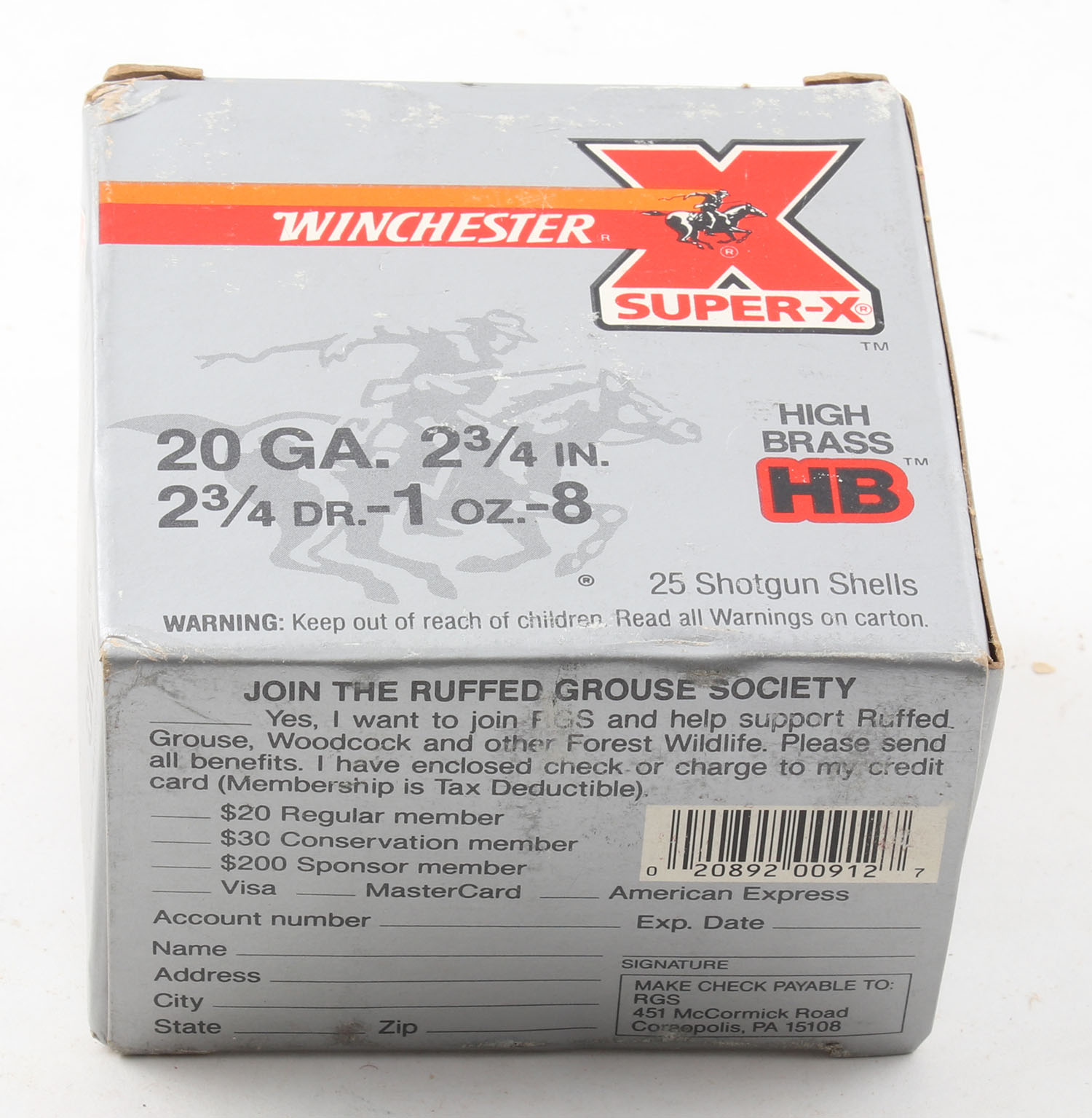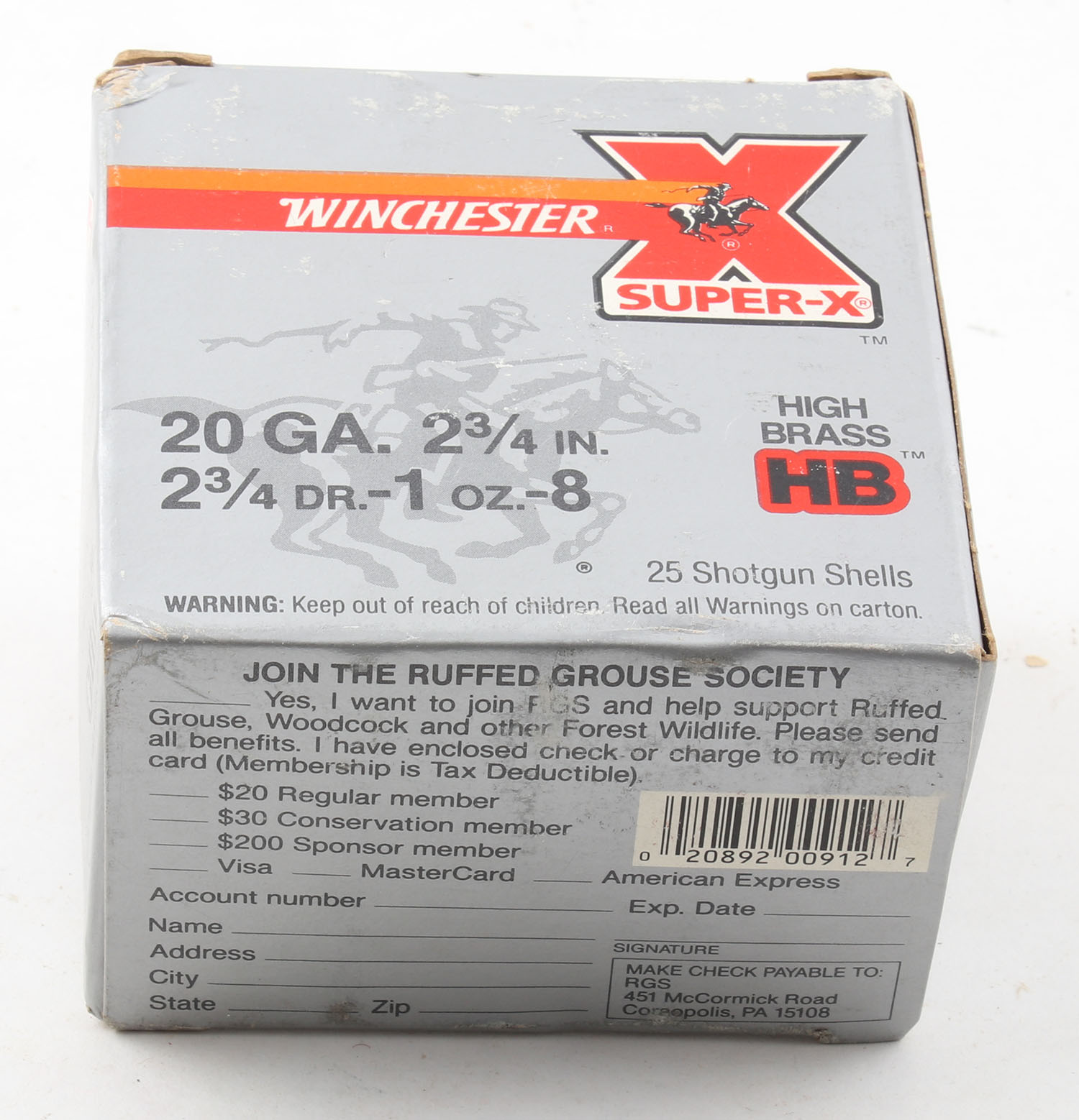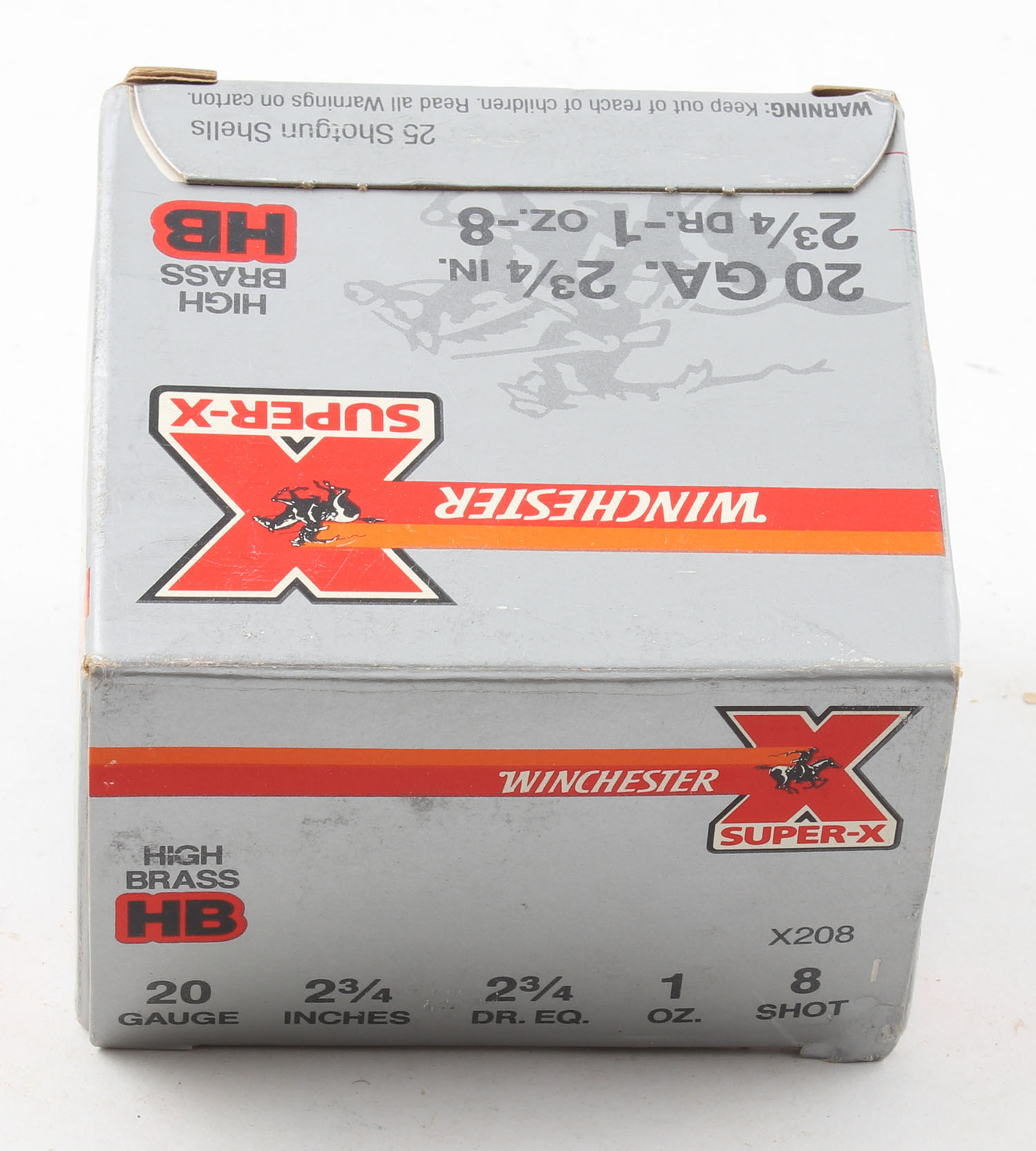 Winchester, Super-X, High Brass, 20ga., 1pc., Full, shot size 8, 2 3/4'', box is solid, plastic shells are excellent. Grade: Excellent - Value: 10 to 30