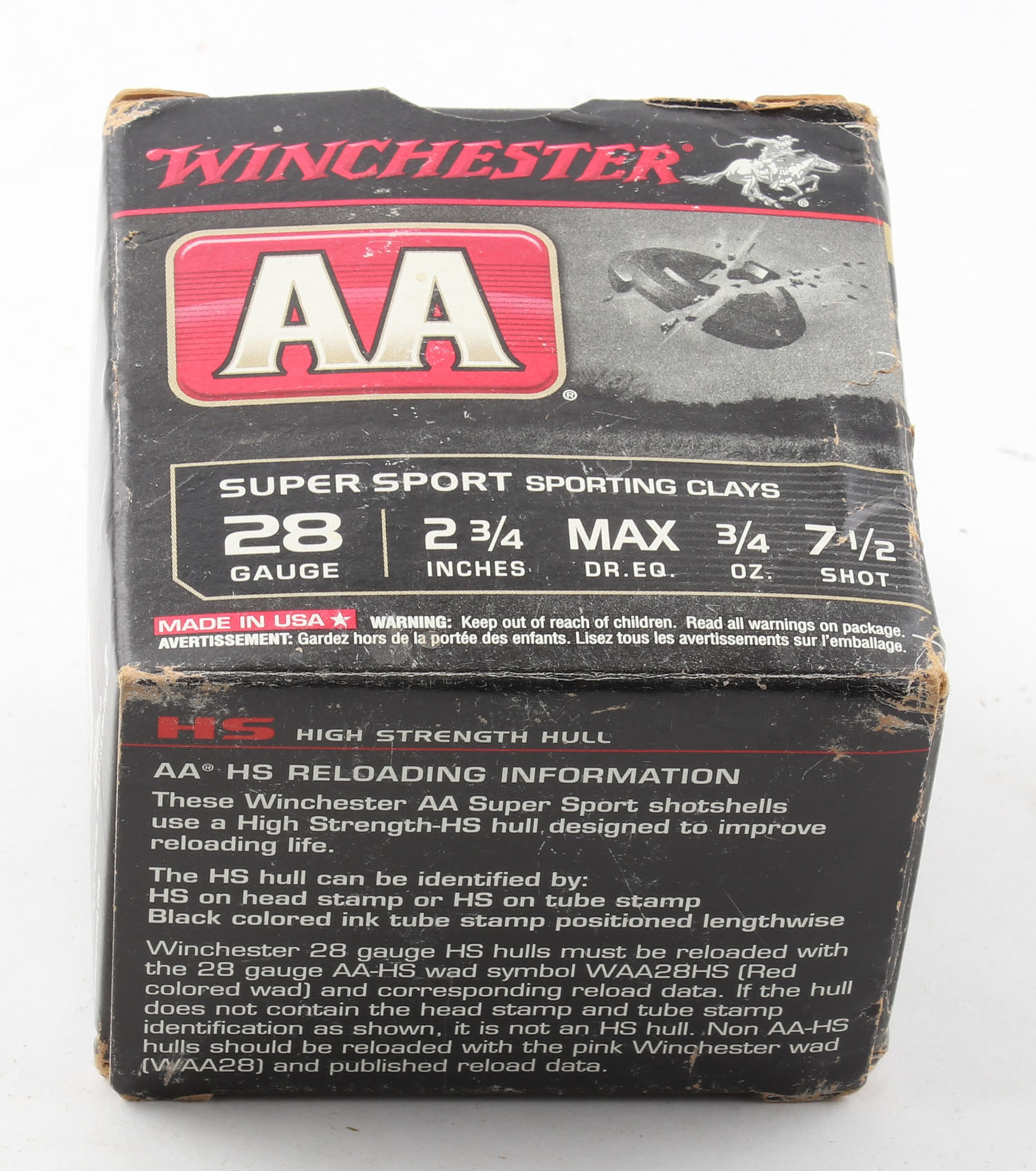 Winchester, AA Super Sport, 28ga., 1pc., Full, shot size 7 1/2, multi-colored box, box is very solid, plastic shells are excellent. Grade: Very Good - Value: 10 to 30