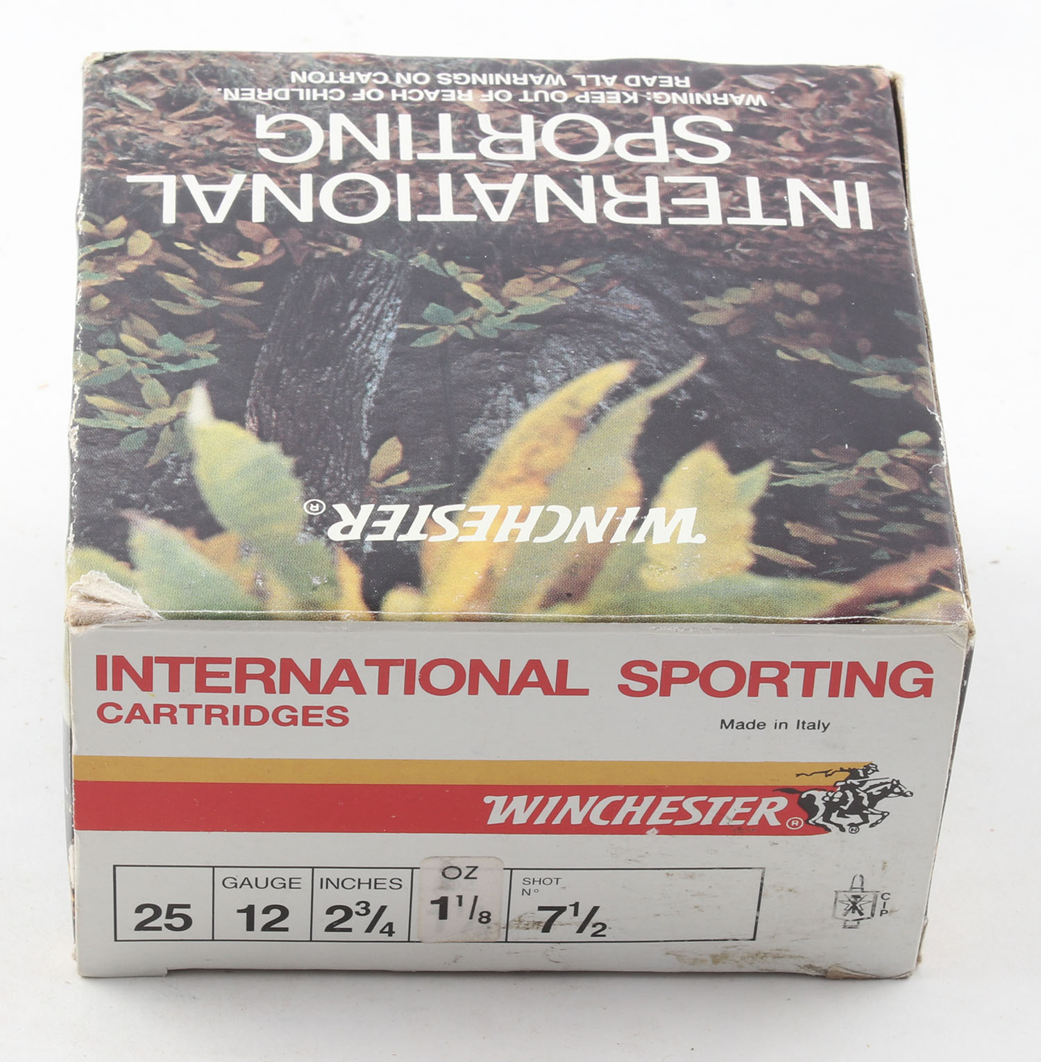 Winchester, International Sporting, 12ga., 1pc., Full, shot size 7 1/2, 2 3/4'', box is very solid with excellent color, plastic shells are excellent. Grade: Excellent - Value: 10 to 40
