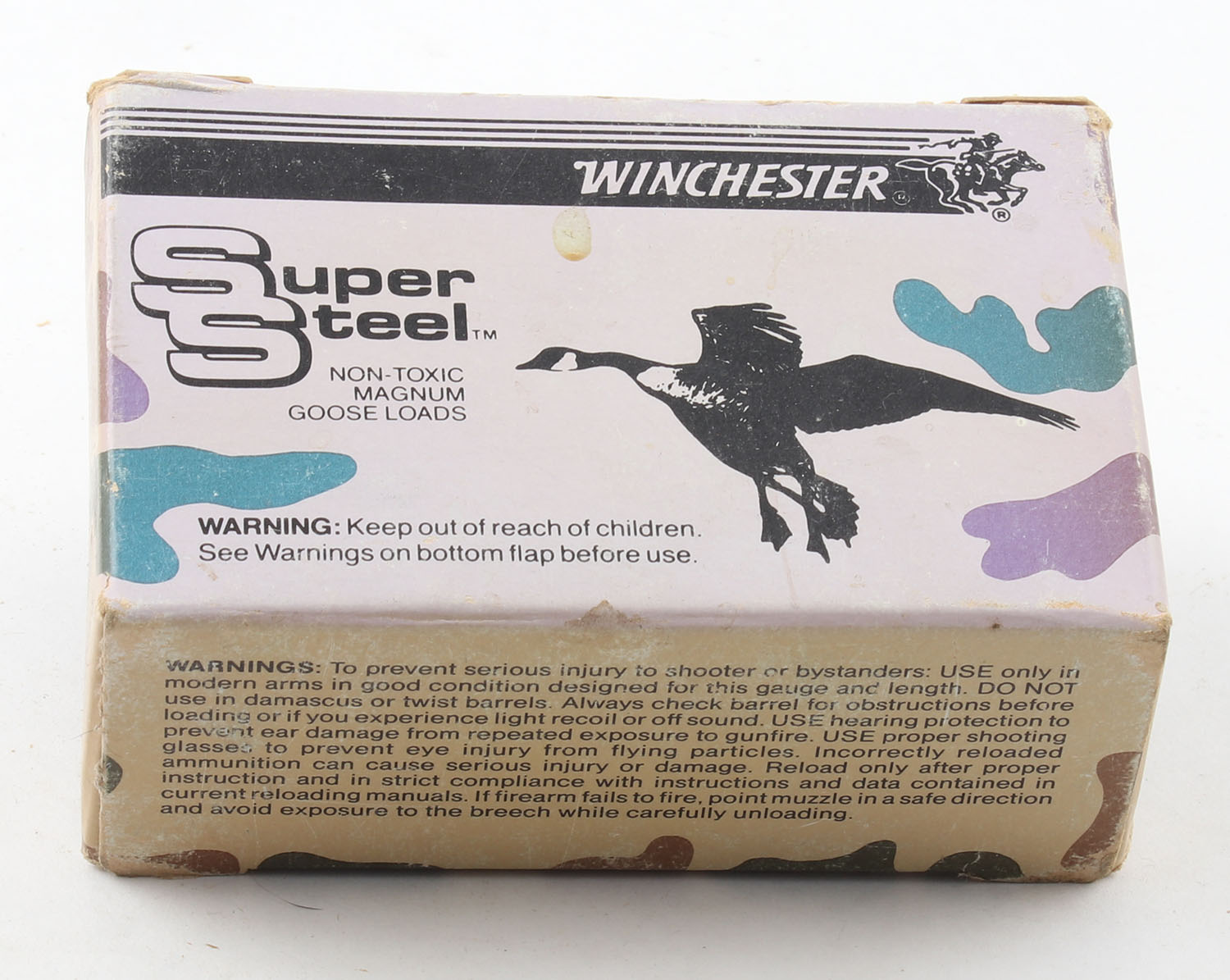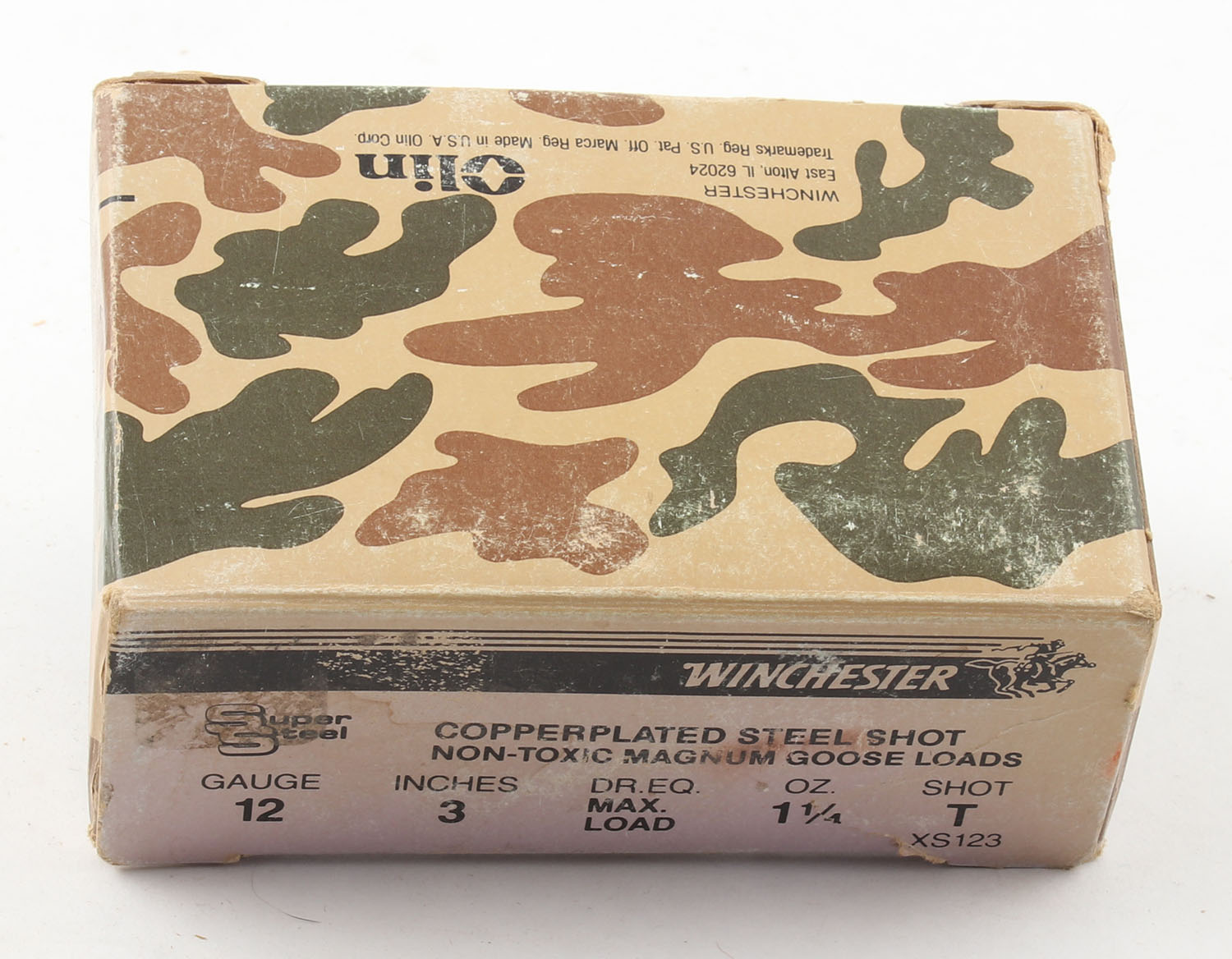 Winchester, Super Steel, 12ga., 1pc., Full, shot size T, 3'', box is solid, plastic shells are excellent. Grade: Very Good - Value: 10 to 30