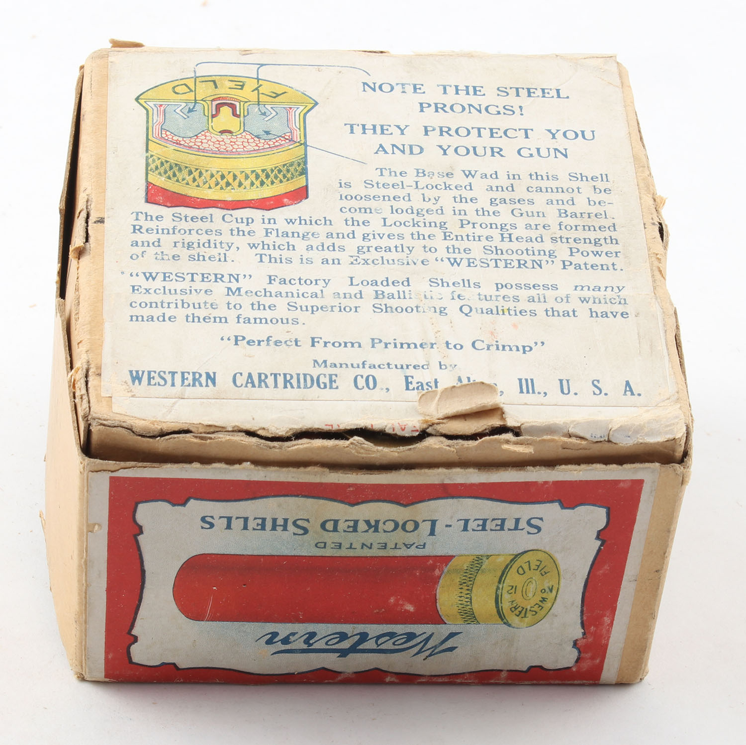 Western, Field/Super X, Label was made during transition from Field boxes to Super X boxes. 12ga., 2pc, Full, shot size 4Ch., buff box with multi-colored label, box has two seam splits to top , has light age soiling with edge wear, paper shells are excellent. Grade: Very Good - Value: 100 to 200