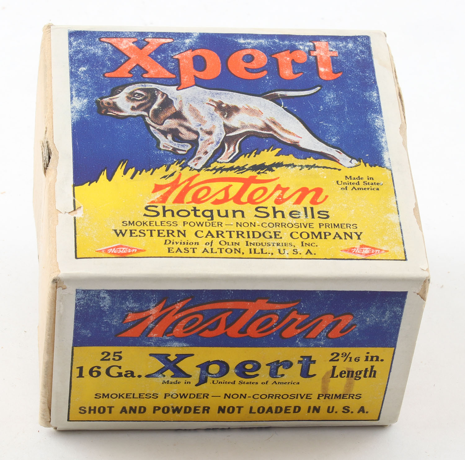 Western, Xpert, 16ga., 2pc., FULL and SEALED, shot size 0, buff box with blue and yellow paper label that pictures the pointer dog on top, box is very solid has light age soiling with great colors. Front of box says ''Shot and Powder Not Loaded In U.S.A'' but says ''Made In United States Of America'' on top of box, loaded in Mexico. Grade: Excellent + - Value: 100 to 250
