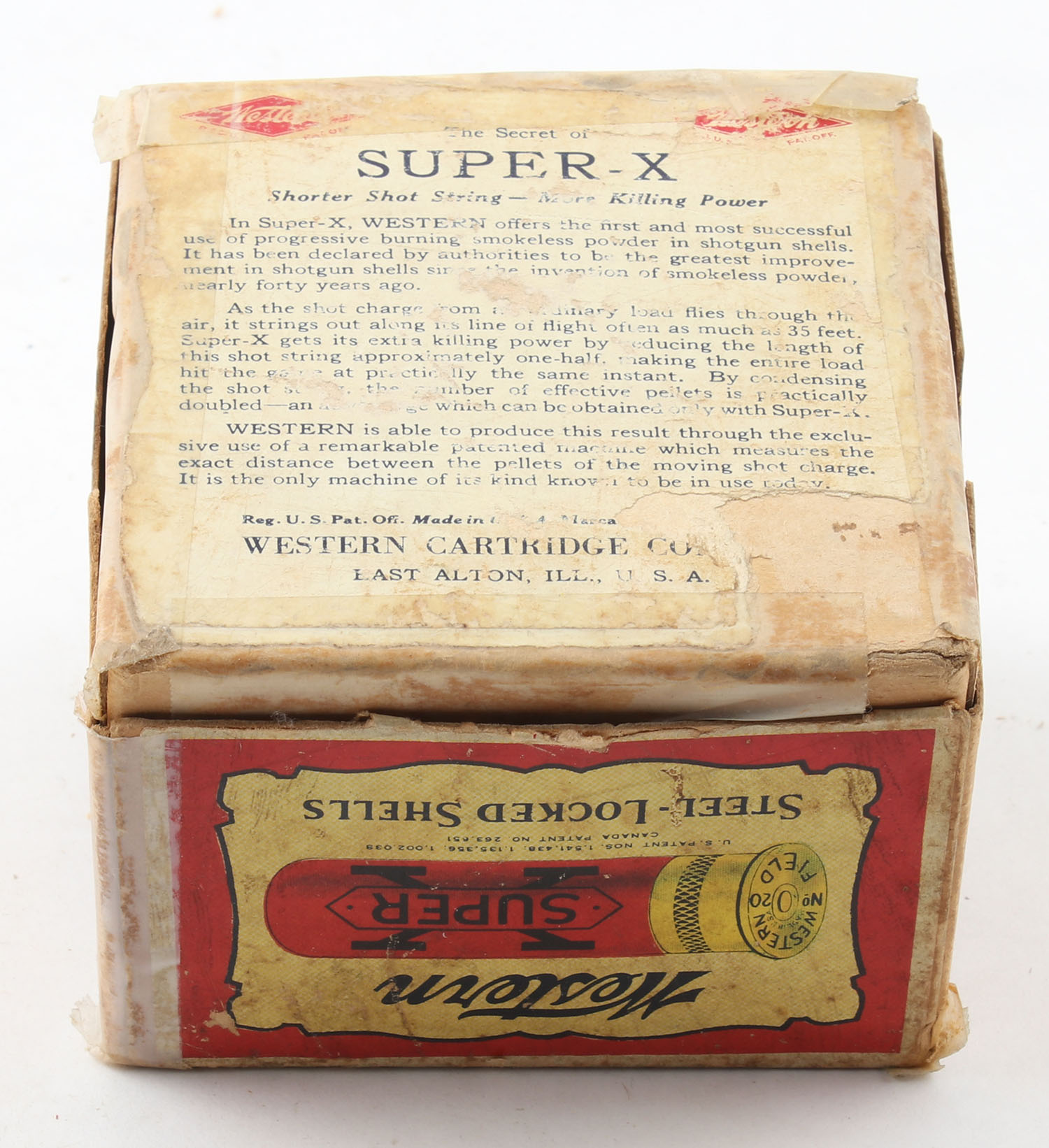 Western, Super X, 20ga., 2pc., Full, shot size 7 1/2Ch., buff box with multi-colored label, box has seam splits to top & bottom with tape repairs, side label is partially torn, label is about 85% intact, paper shells are excellent. Grade: Good - Value: 20 to 60