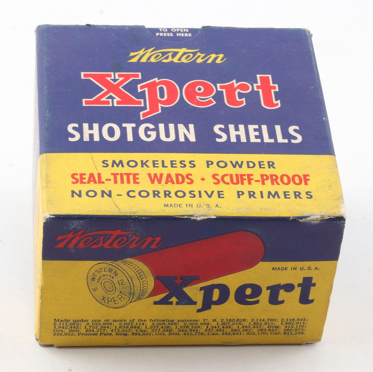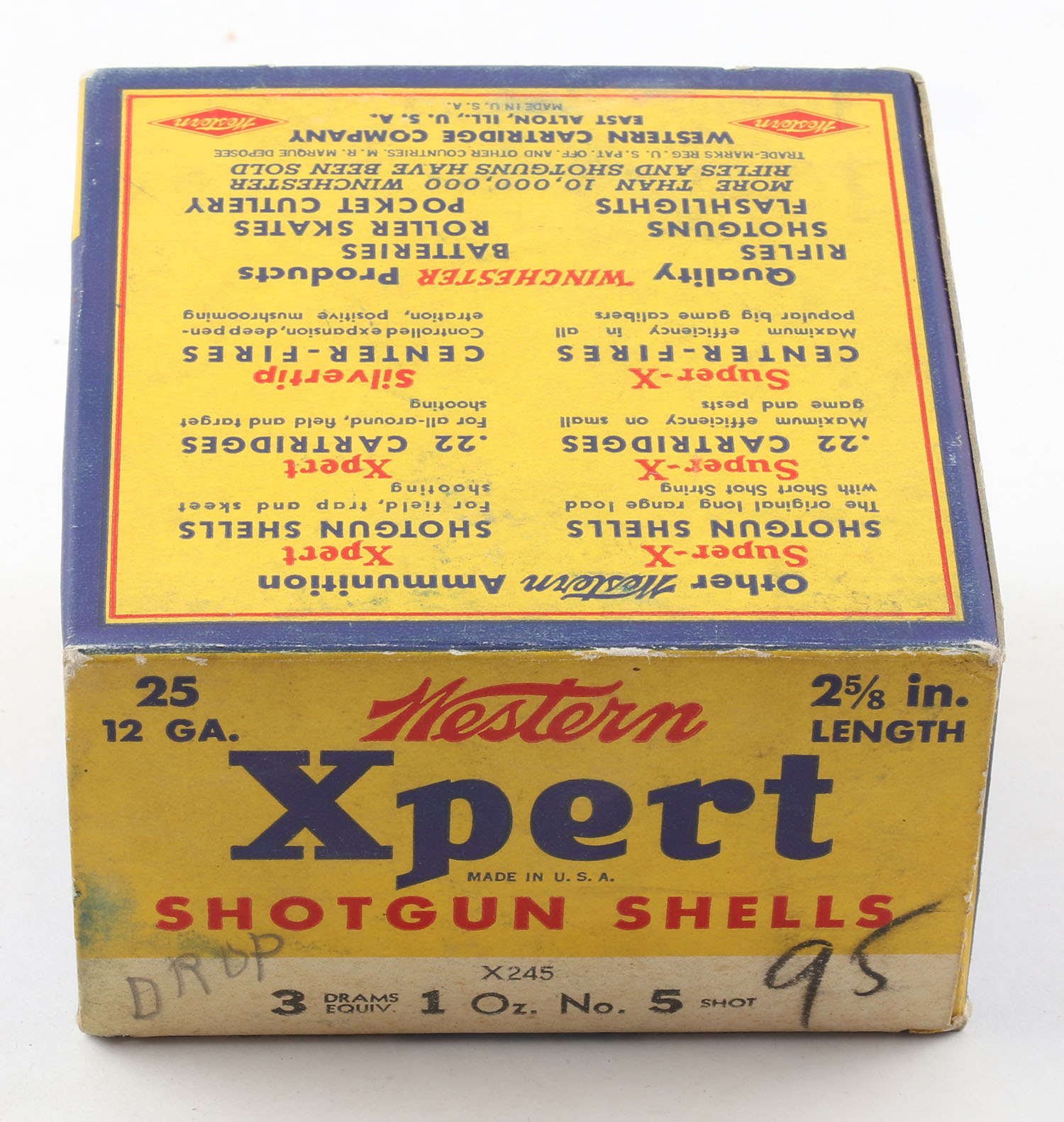 Western, Xpert, 12ga., 1pc., Full, shot size 5, 2 5/8'', multi-colored box, box is solid with excellent color, box has writing to top flap, paper shells are excellent. Grade: Excellent - Value: 10 to 30