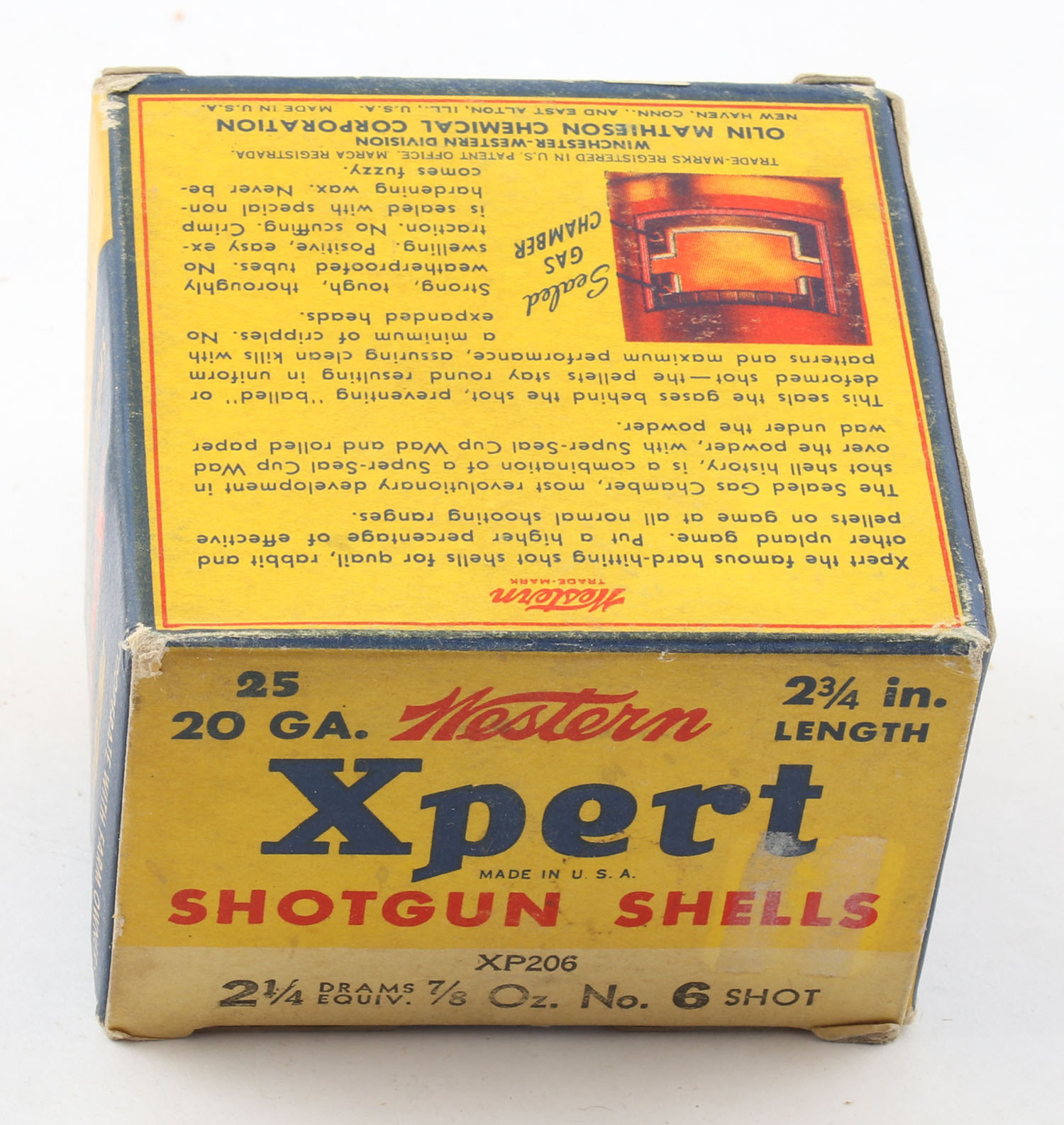 Western, Xpert, 20ga., 1pc., Full, shot size 6, 2 3/4'', multi-colored box, box is very solid with excellent color, paper shells are excellent. Grade: Excellent - Value: 10 to 30