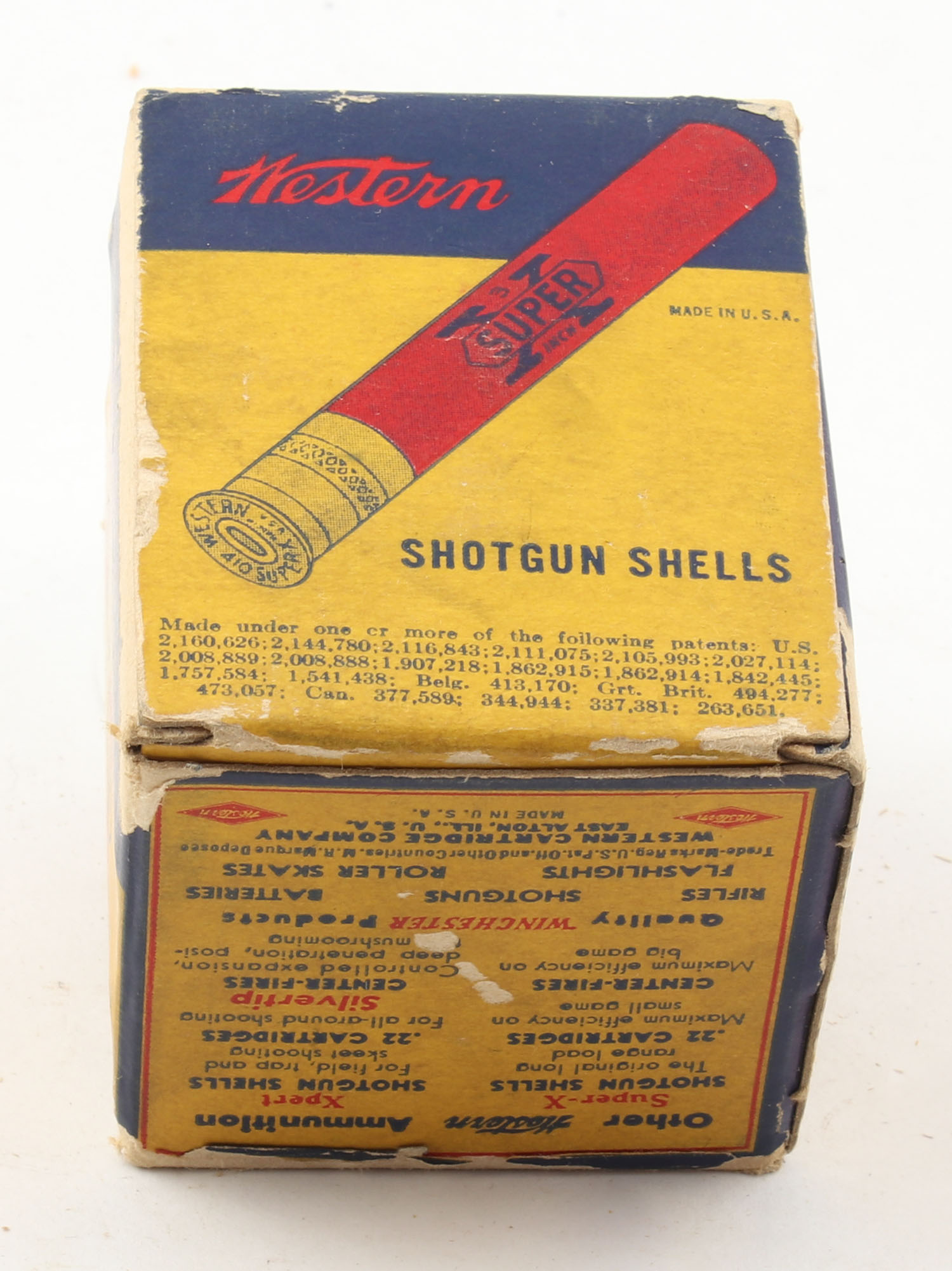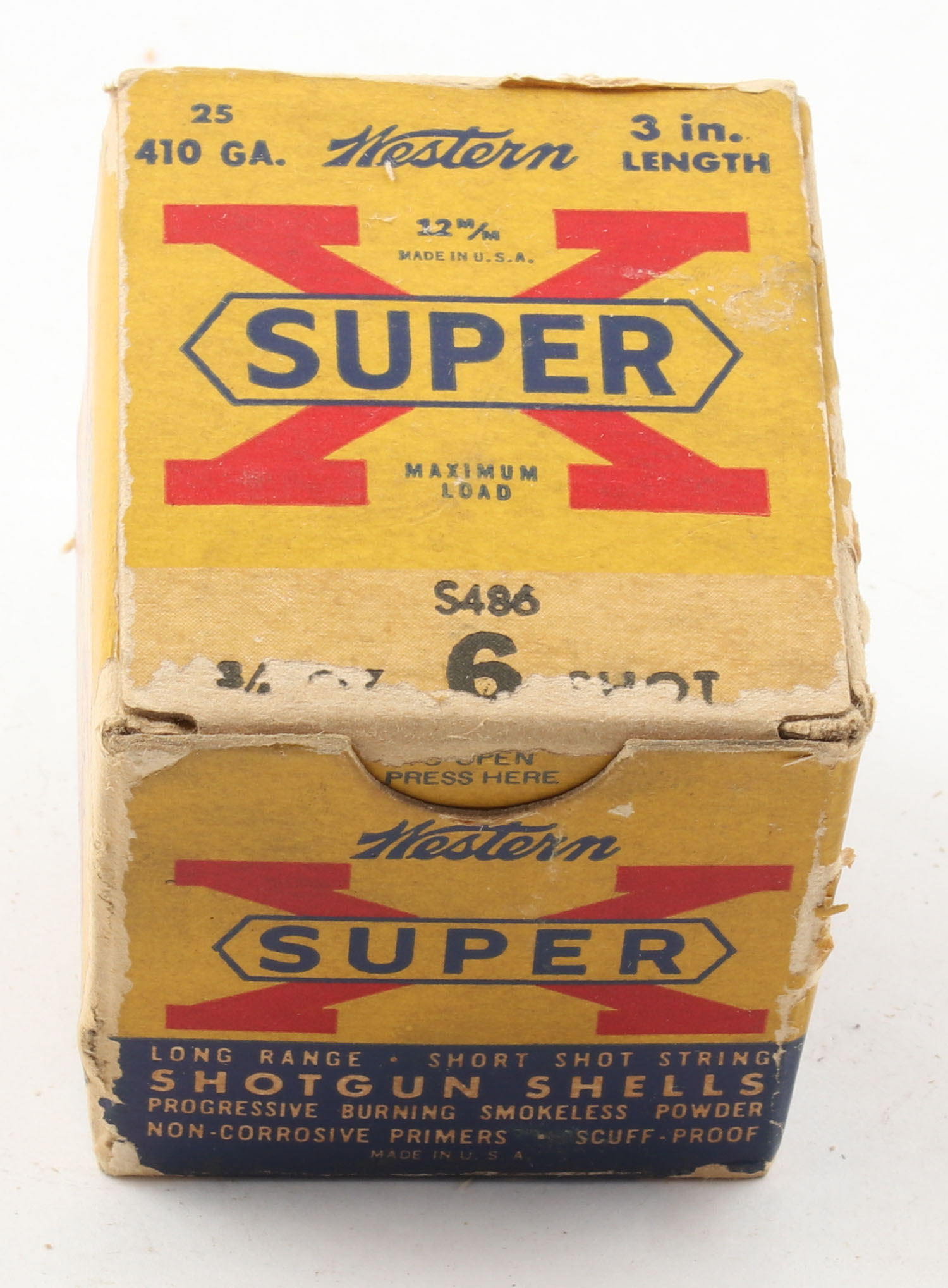 Western, Super X, 410ga., 3'', 1pc., Full, shot size 6, multi-colored box, box is solid with light age soiling, paper shells are excellent. Grade: Very Good - Value: 10 to 30