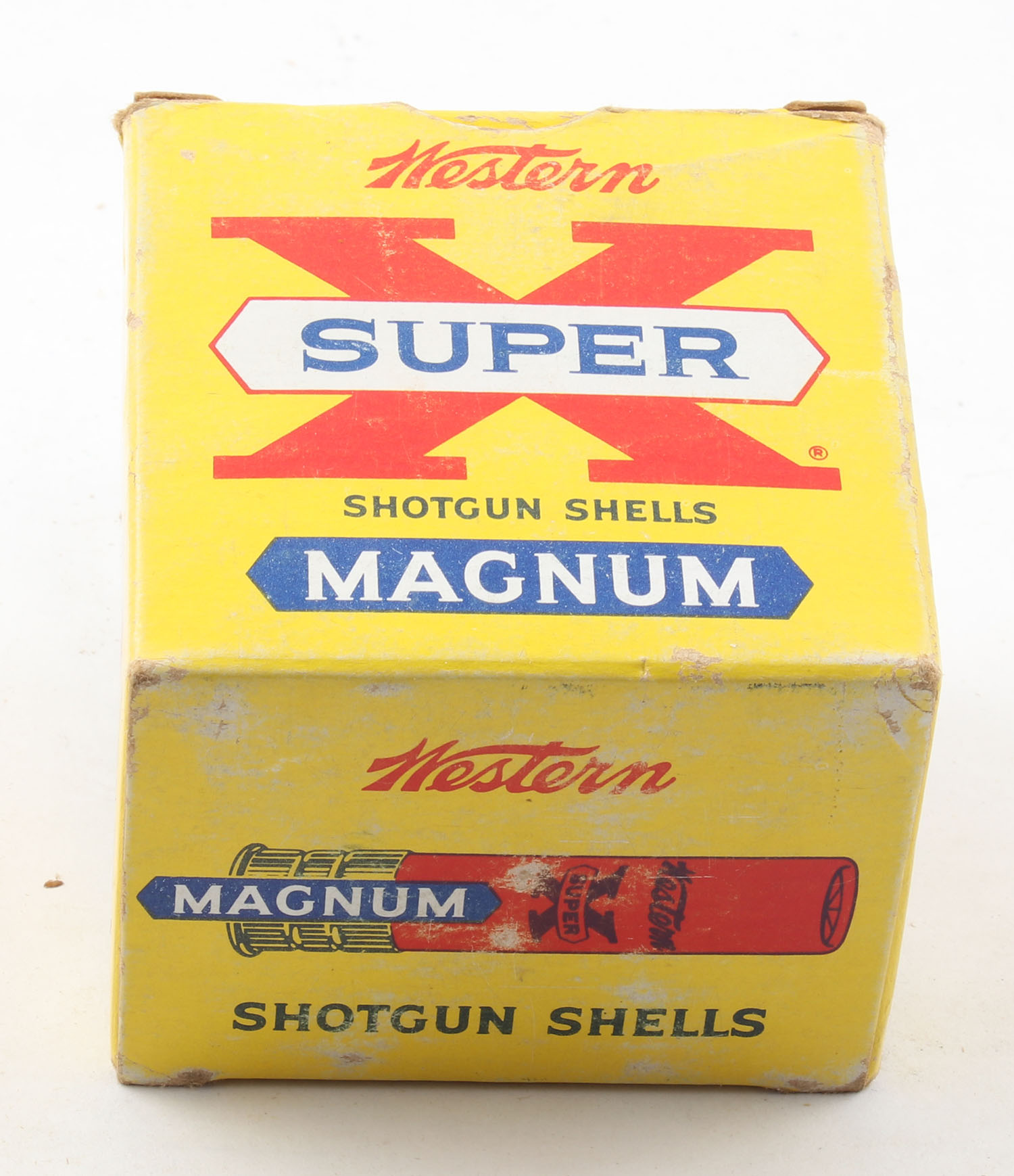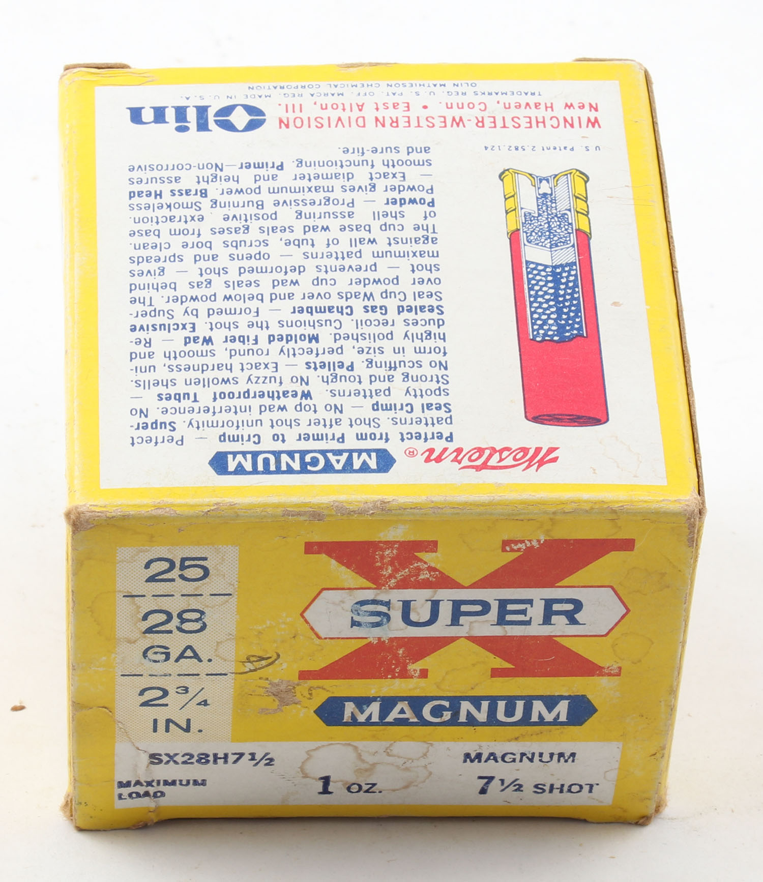 Western, Super X, 28ga., 2 3/4'', 1pc., Full, shot size 7 1/2 Magnum, multi-colored box, box has scuffing with edge wear, paper shells are excellent. Grade: Very Good + - Value: 10 to 30