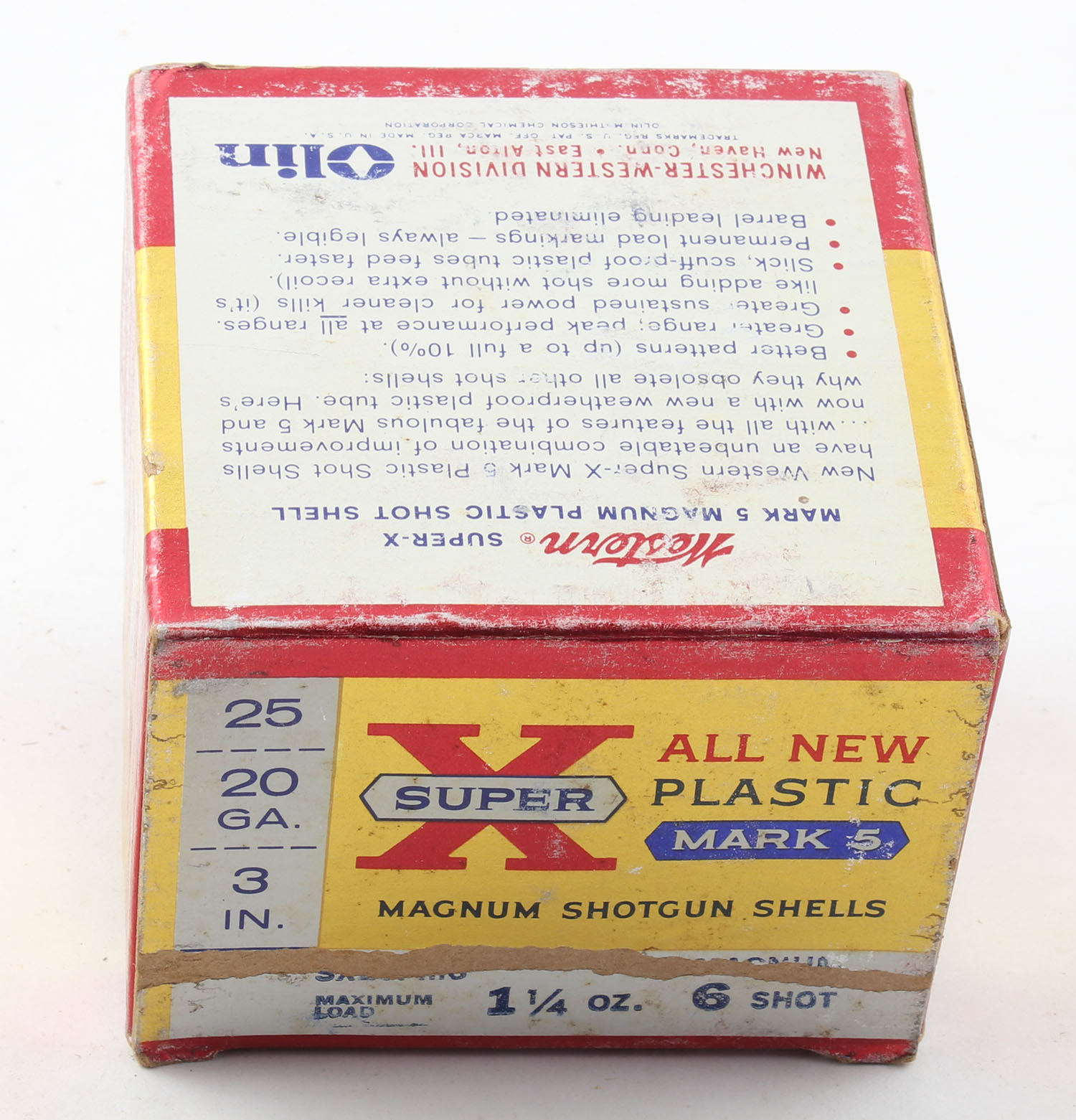 Western, Super X, Mark 5, 20ga., 3'', 1pc., Full, shot size 6 Magnum, multi-colored box, box has scuffing & light edge wear, box has very nice colors, plastic shells are excellent. Grade: Very Good ++ - Value: 10 to 30