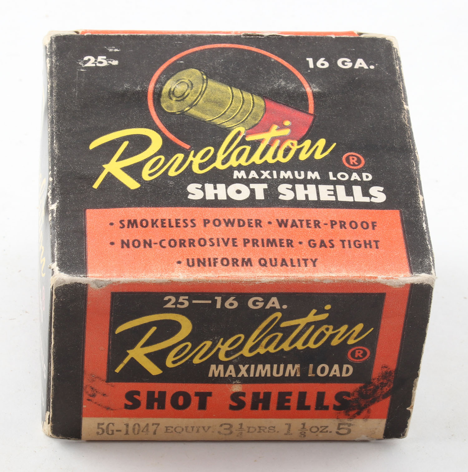 Revelation, Maximum Load, 16ga., 1pc., Full, shot size 5, multi-colored box, box has edge & corner wear with great colors, paper shells are excellent. Grade: Very Good ++ - Value: 10 to 30