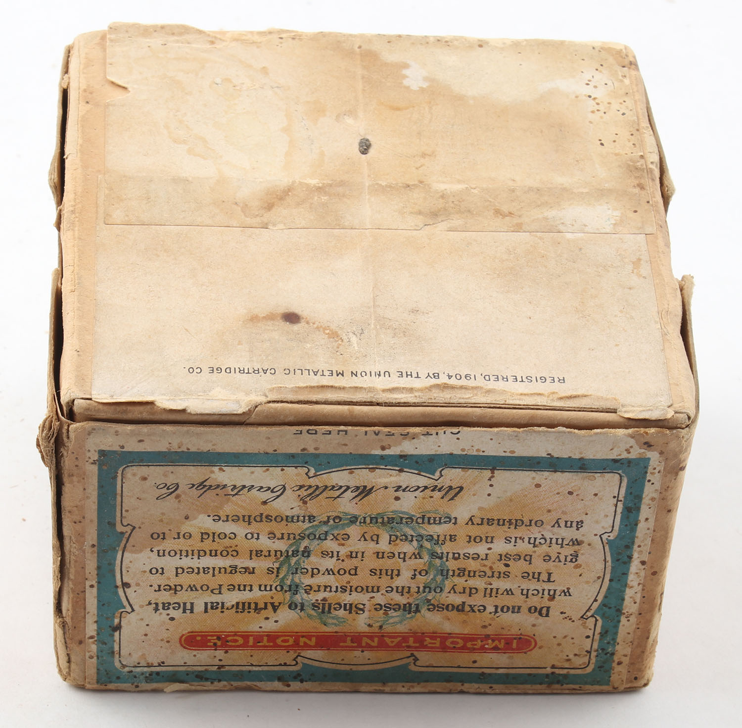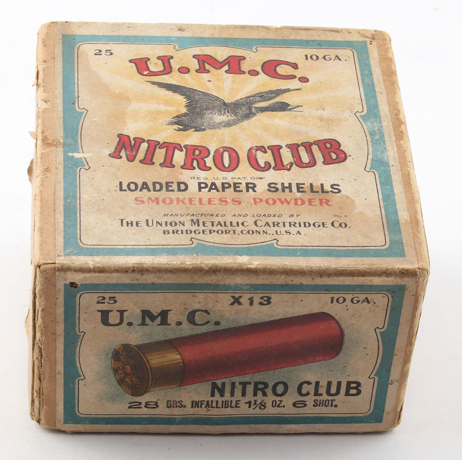 U.M.C., Nitro Club, 10ga., 2pc., Empty, shot size 6, buff box with sunburst logo & Mallard flying on top, box has overstamp ''STEEL LINED'' on side, box has age soiling with edge & corner wear. Grade: Very Good ++ - Value: 50 to 200