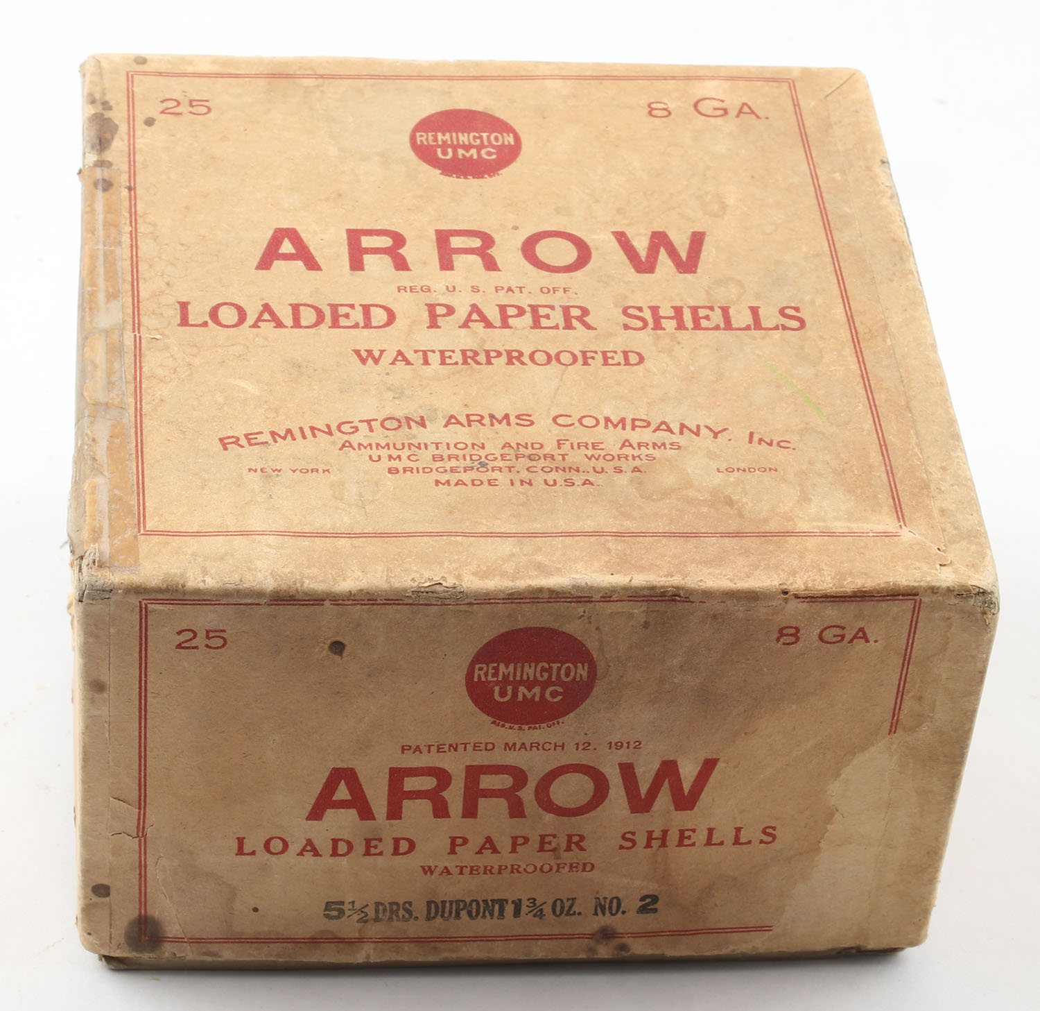 Remington, ARROW, 8ga., 2pc., Partial 19 rds., shot size 2C, buff box with buff & red label, box is solid with some age soiling, paper shells are excellent. Grade: Very Good ++ - Value: 200 to 600