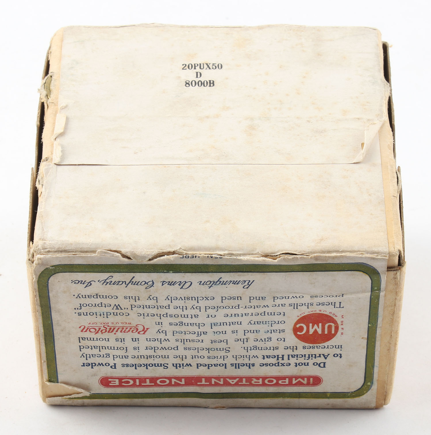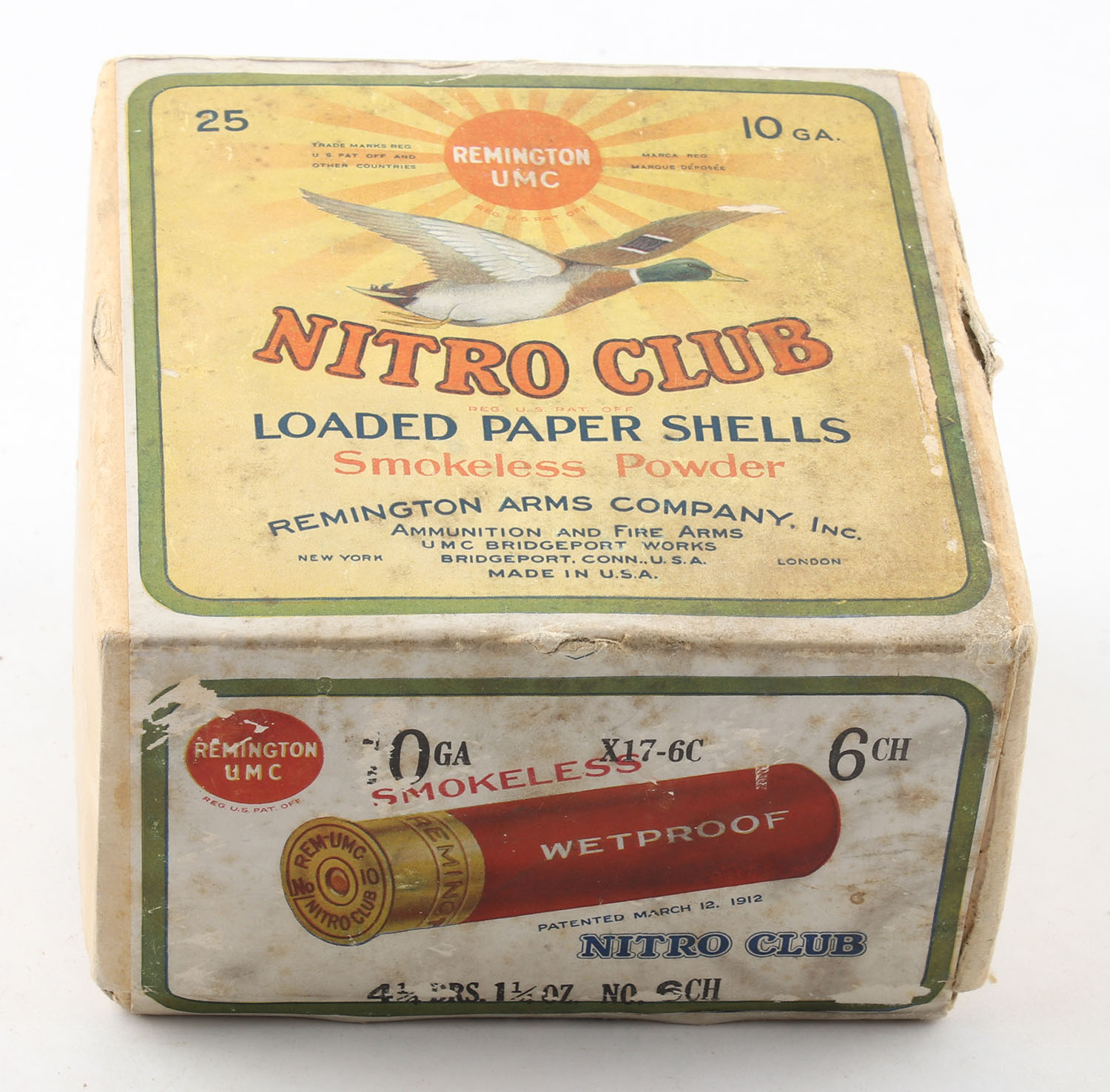 Remington UMC, Nitro Club, 10ga., 2pc., FULL & HALF SEALED, Loading: 4 1/4 Drs., 1 1/4 Oz., Shot size 6CH, buff box with sunburst logo & Mallard flying on top, box has light age soiling & edge wear, has minor shell protrusion to bottom and top. Grade: Very Good ++ - Value: 100 to 400