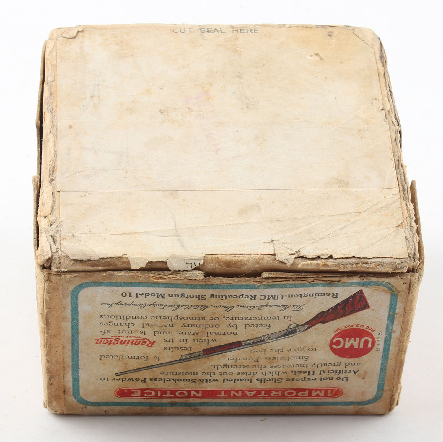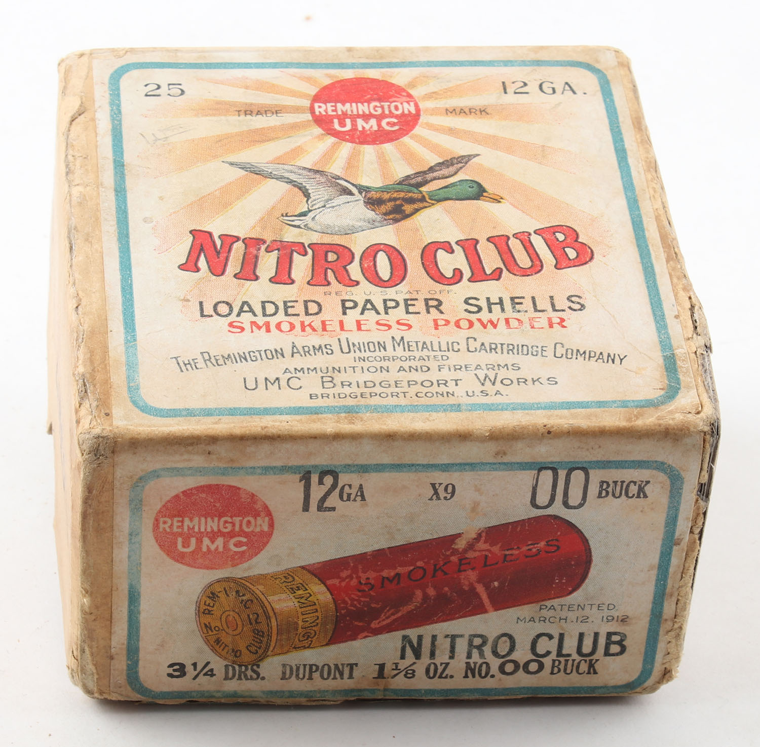 Remington UMC, Nitro Club, 12ga., 2pc., Partial 15rds., shot size 00 Buck, buff box with sunburst logo & Mallard flying on top, box has repairs including on the seams, paper shells are excellent. Grade: Good ++ - Value: 40 to 100