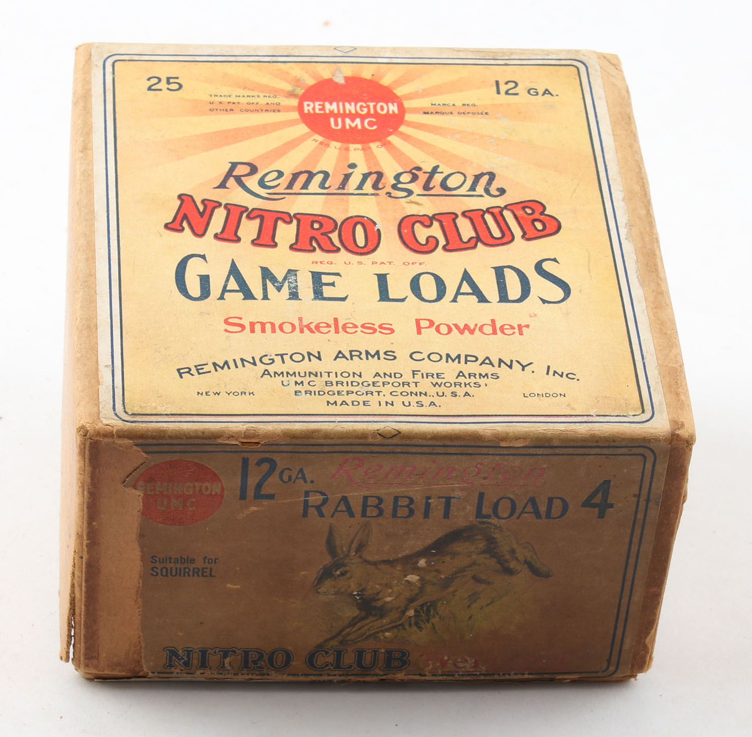 Remington UMC, Nitro Club, GAME LOADS, RABBIT LOAD, 12ga., 2pc., Full of Fired shells with 8 being correct, shot size 4, buff box with sunburst logo & RABBIT on side, box has age soiling with some edge wear, fired shells are fair. Grade: Good ++ - Value: 100 to 400