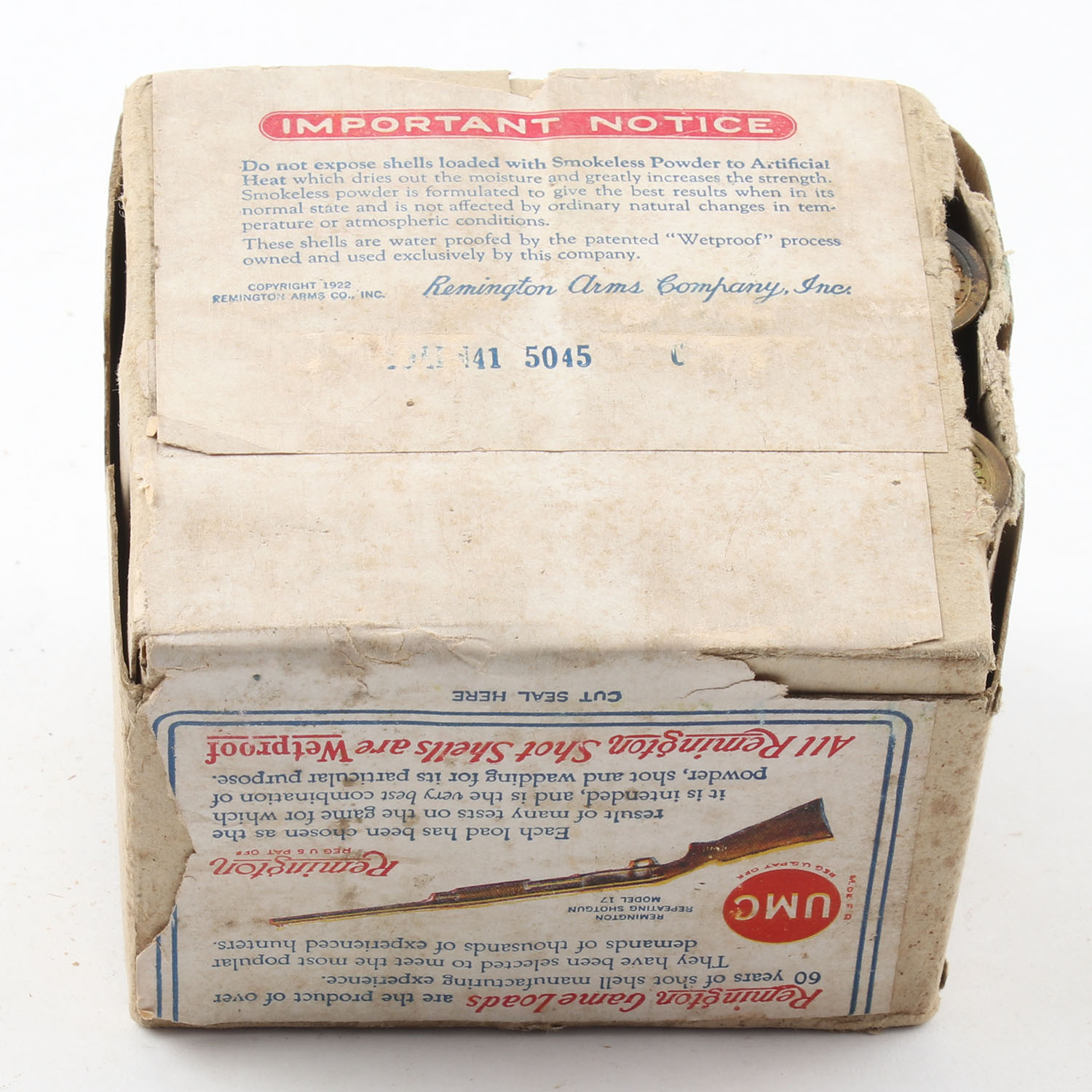 Remington UMC, Nitro Club, GAME LOADS, HEAVY DUCK LOAD, 20ga., 2pc., FULL & HALF SEALED, buff box with sunburst logo & Mallard flying, box has age soiling & scuffing, has light shell protrusion to top & bottom, label appears 70% intact. Grade: Good ++ - Value: 50 to 150