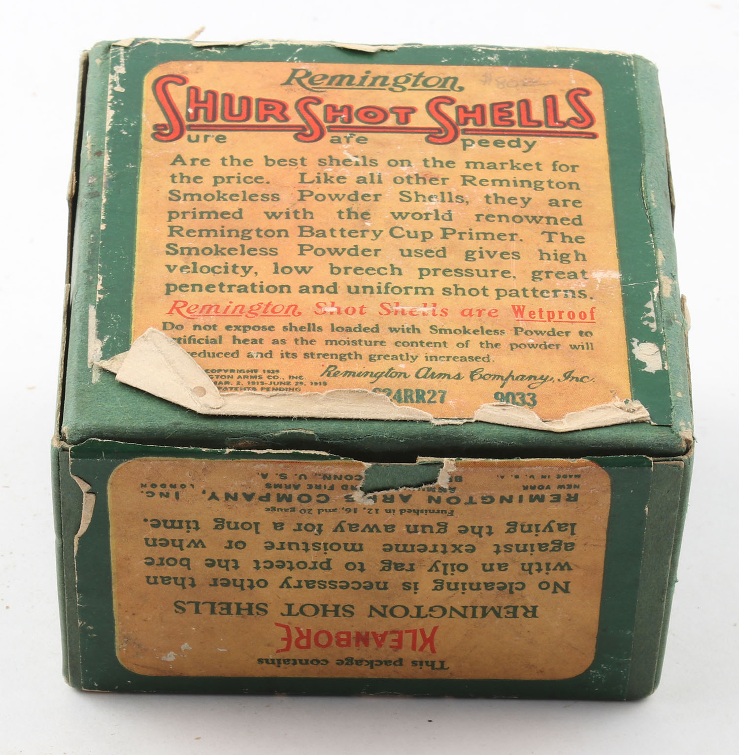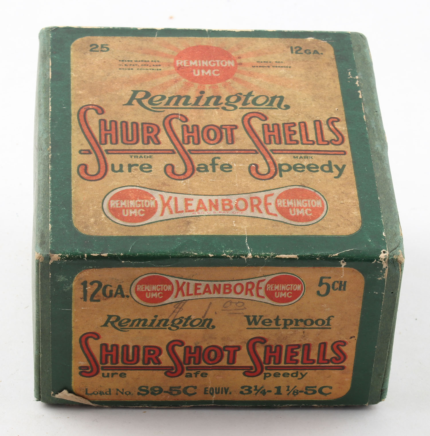 Remington UMC, Shur Shot Shells, 12ga., 2pc., Partial 20rds., shot size 5CH., green box with green, yellow & red paper label, box has light age soiling with edge wear, paper shells are very good. Grade: Very Good ++ - Value: 40 to 150