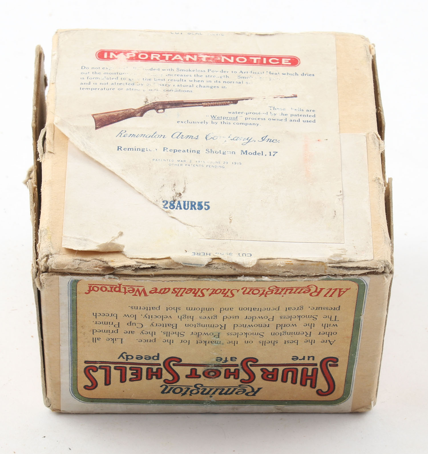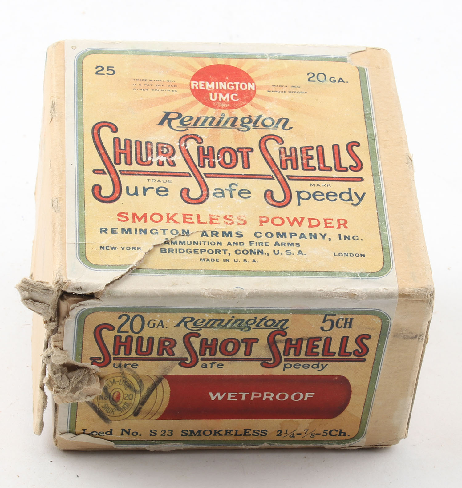Remington UMC, Shur Shot Shells, 20ga., Full, 2pc., shot size 5CH, 2 1/4'', buff box with cream, green, white & orange paper label, box has age soiling & edge wear, box has a tear to seam, bottom has light shell protrusion, paper shells are excellent. Grade: Very Good - Value: 40 to 200