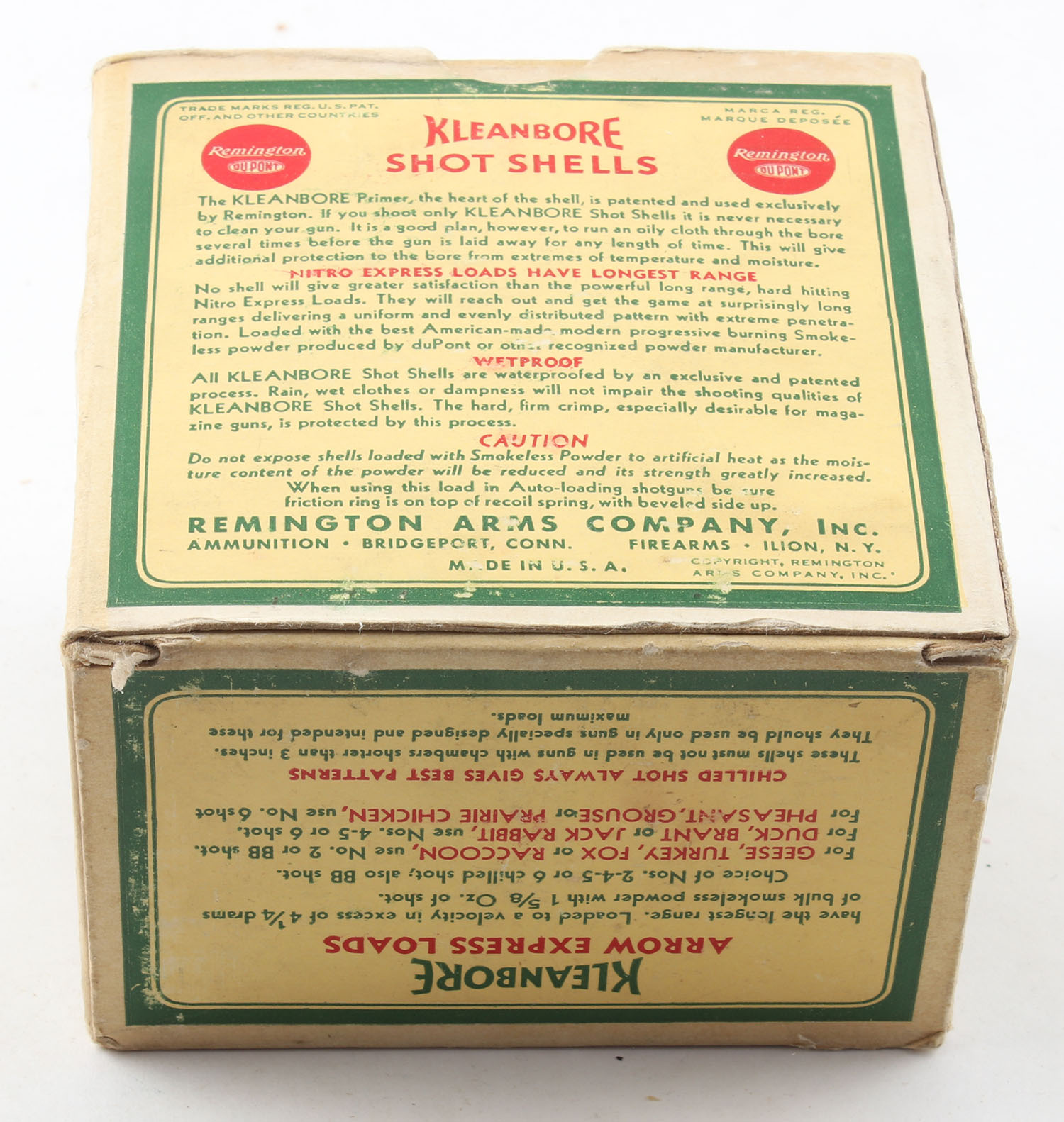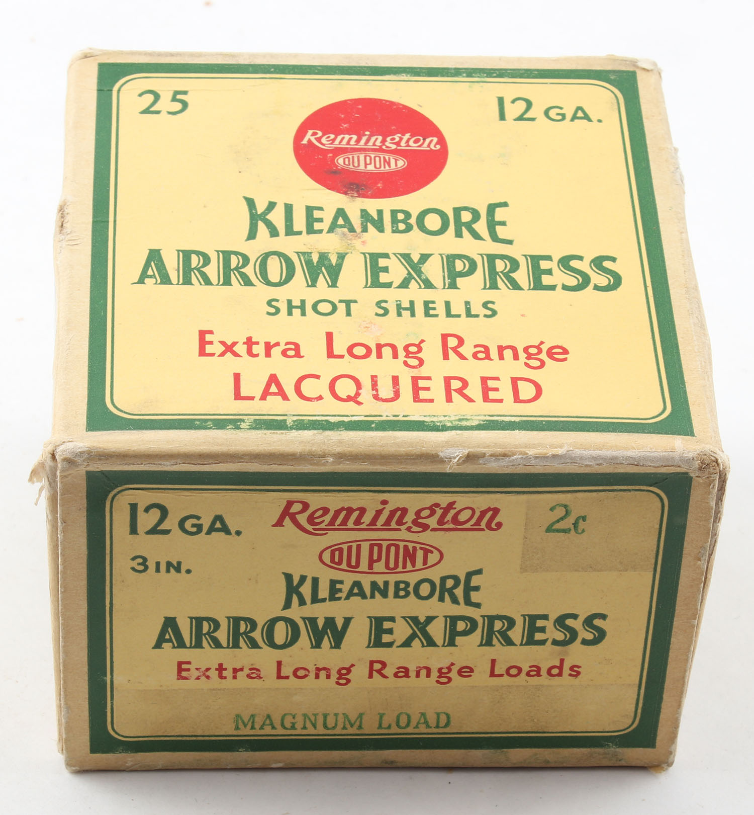 Remington, Kleanbore, ARROW EXPRESS, Extra Long Range Lacquered, 12ga., 1pc., Full, shot size 2C Magnum Load, box is yellow, red and green, box is very solid with great colors, paper shells are minty. Grade: Excellent - Value: 50 to 150
