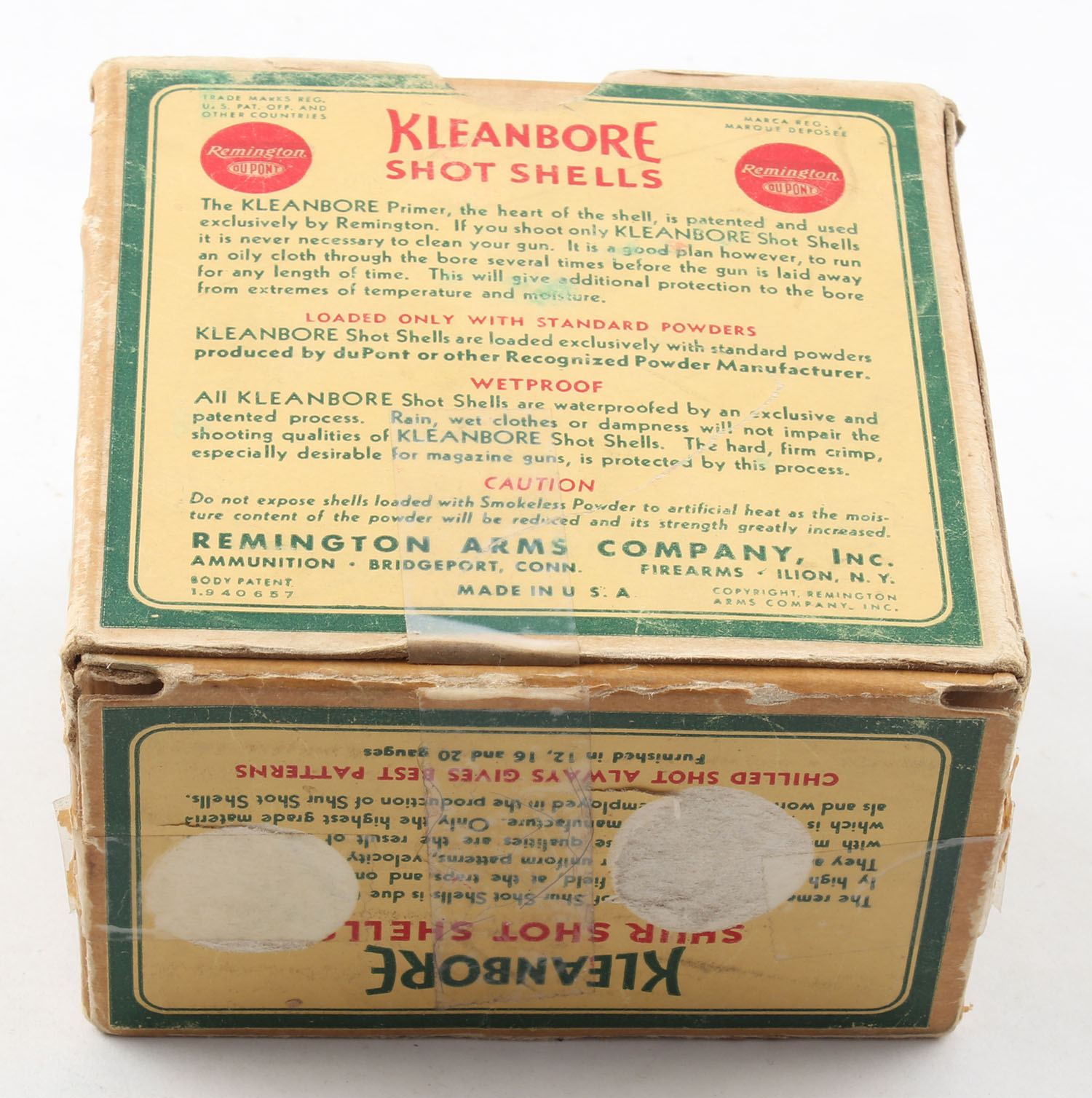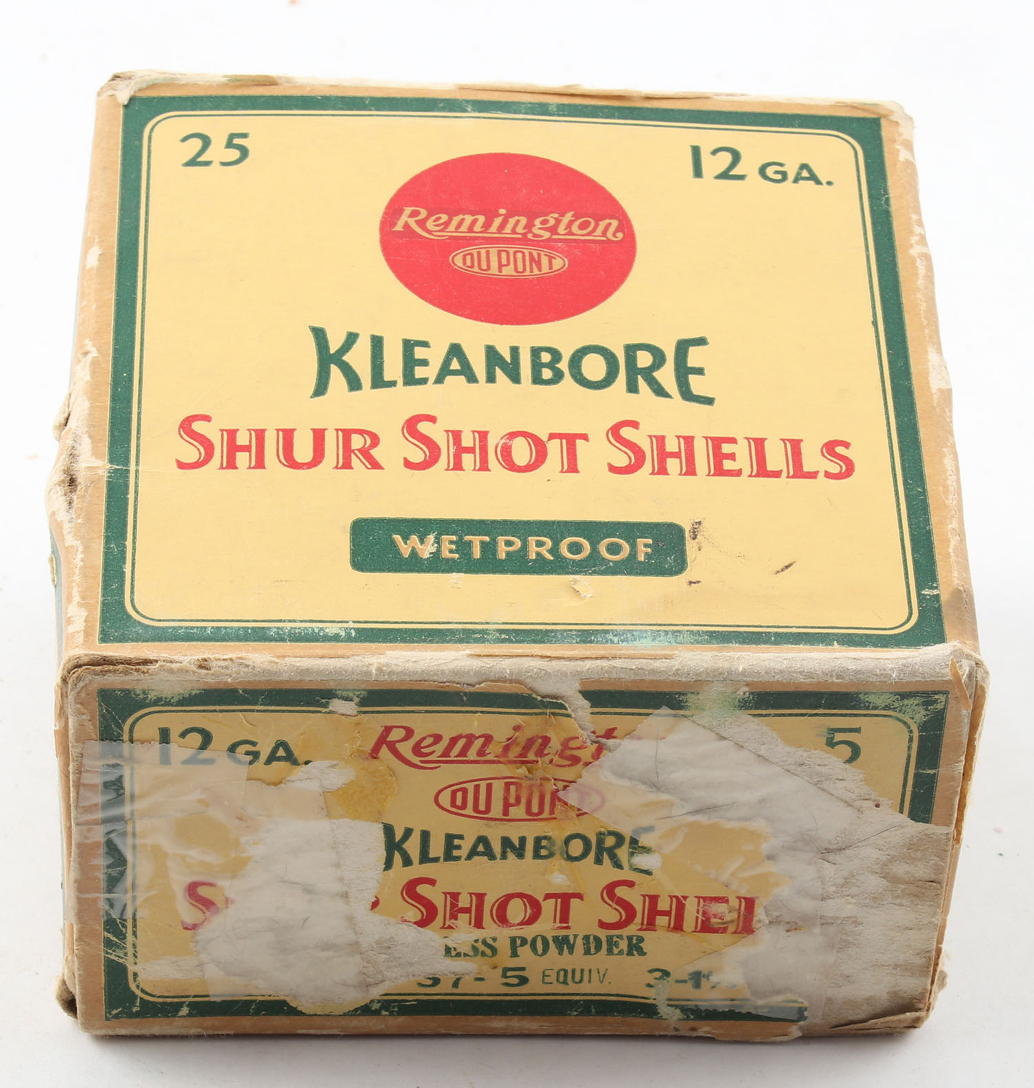Remington, Kleanbore, SHUR SHOT, 12ga., 1pc., Partial 22rds, shot size 5C, box is yellow, red and green, box has age soiling with scuffing & edge wear, paper shells are excellent. Grade: Good - Value: 10 to 30