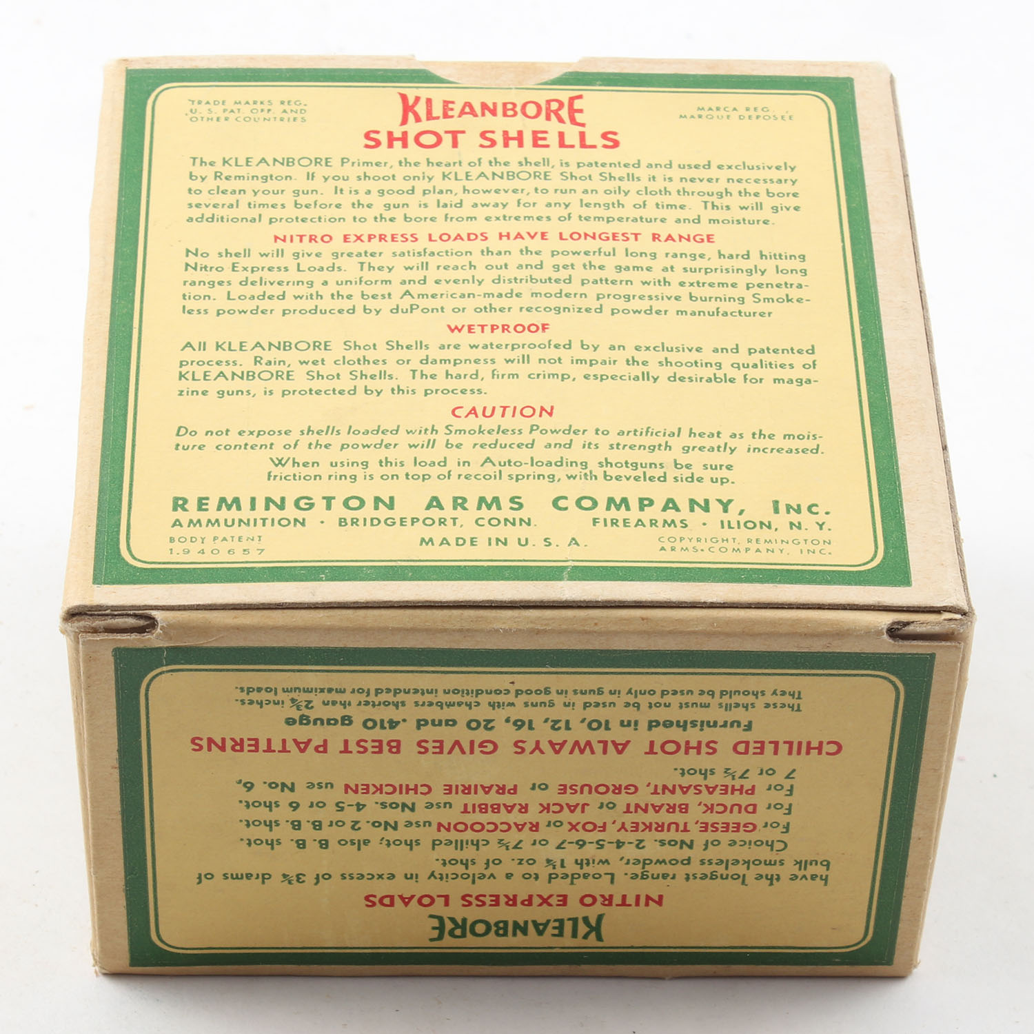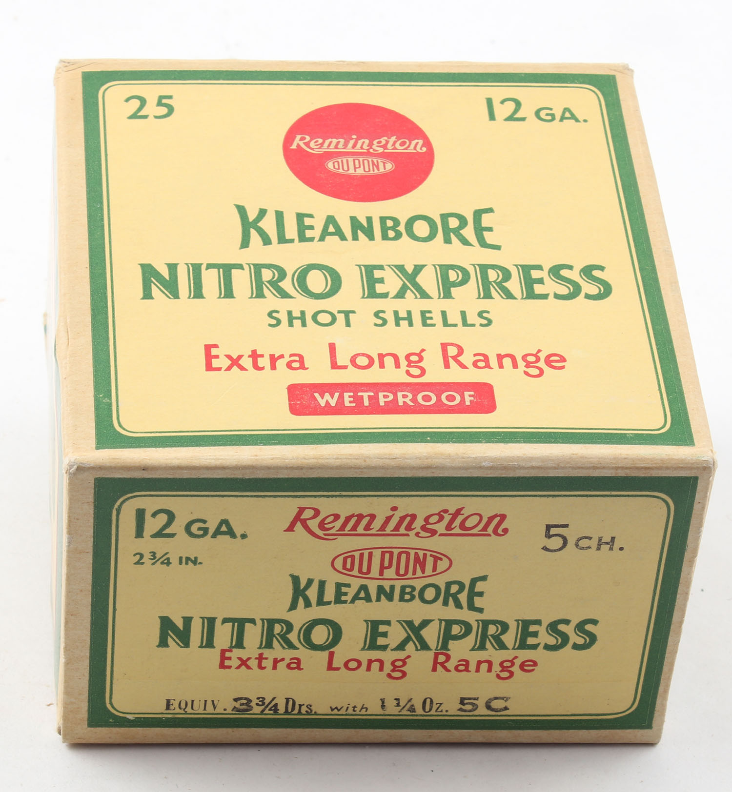 Remington, Kleanbore, NITRO EXPRESS, 12ga., 2 3/4'', 1pc., Full, shot size 5 C, box is buff, yellow, red and green, box is very solid with excellent color, paper shells are excellent. Grade: MINT - Value: 20 to 60
