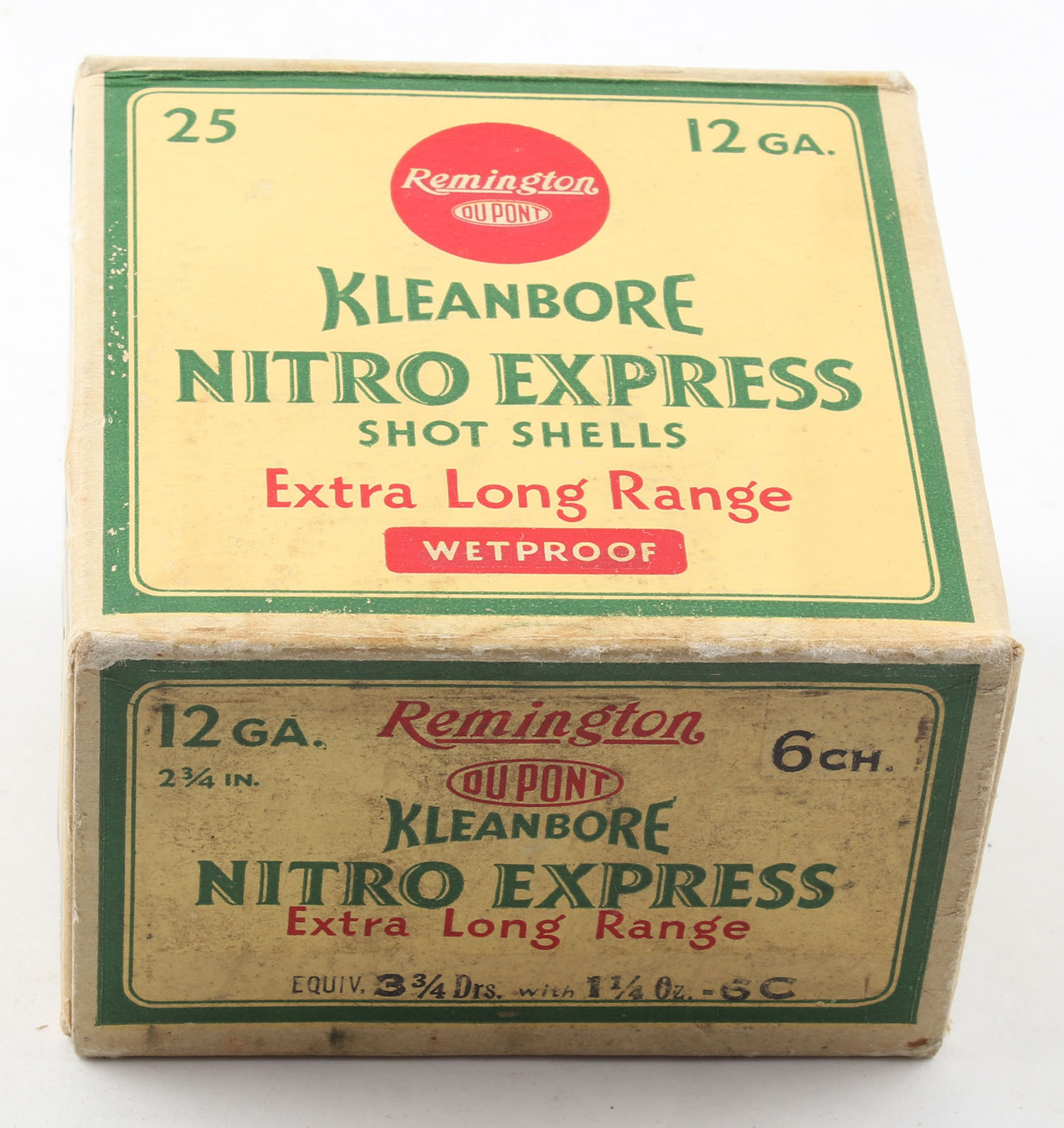 Remington, Kleanbore, NITRO EXPRESS, 12ga., 2 3/4'', 1pc., Full, shot size 6 C, box is buff, yellow, red and green, box has edge wear & scuffing with great colors, paper shells are excellent. Grade: Very Good ++ - Value: 20 to 60