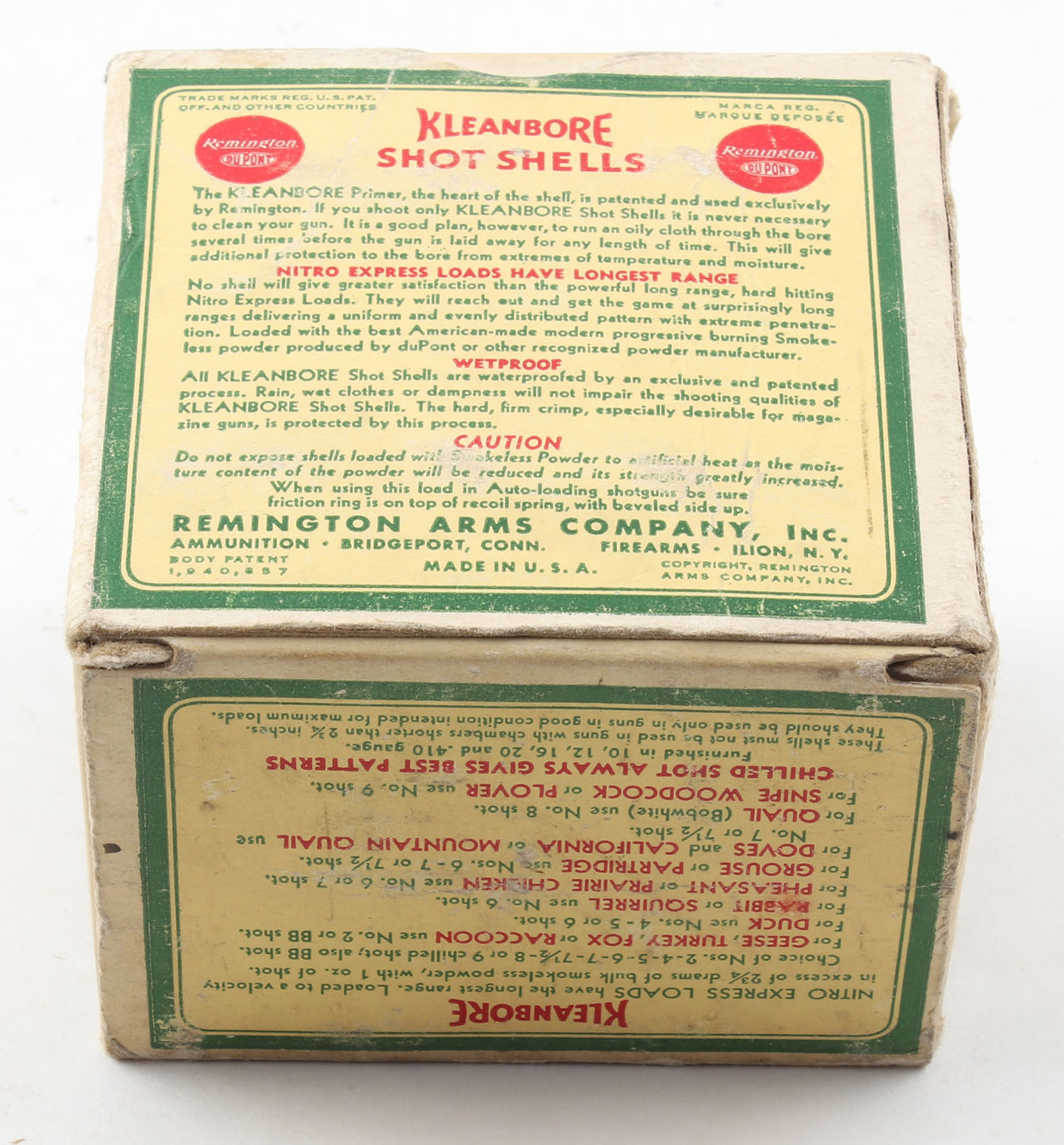 Remington, Kleanbore, NITRO EXPRESS, 20ga., 1pc., Full, shot size 7Ch., box is yellow, red and green, box is solid with edge wear & nice colors, paper shells are excellent. Grade: Very Good ++ - Value: 20 to 60