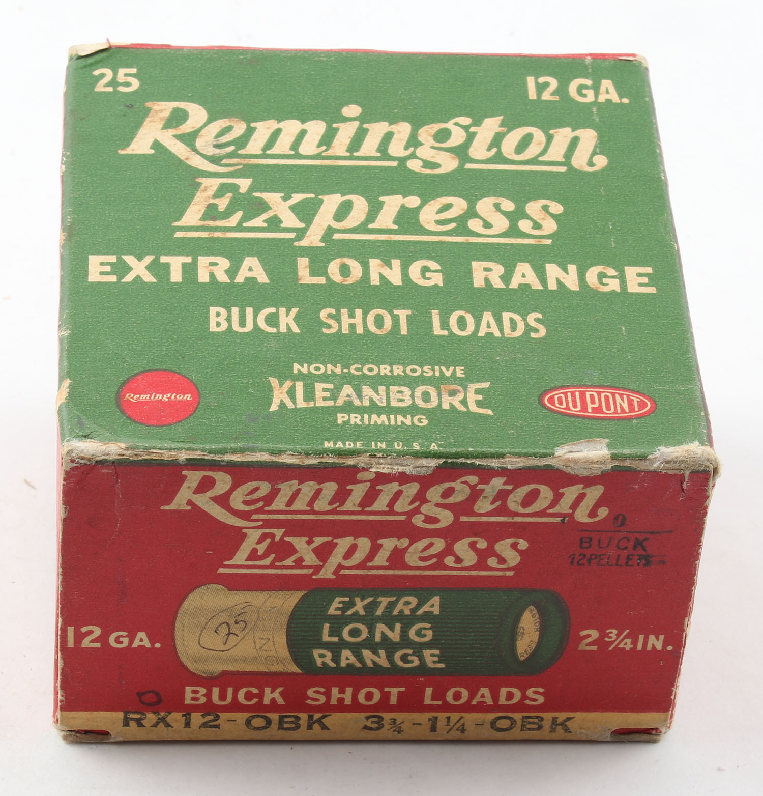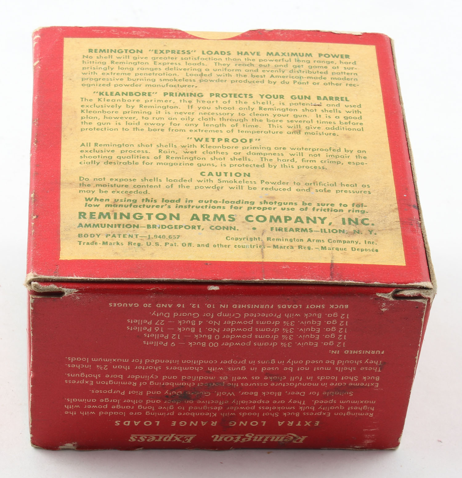 Remington Express, Extra Long Range, 12ga., 2 3/4'', 1pc., Full, Buck Shot Loads, shot size 0BK, box is red, white and green, box has corner & edge wear with excellent color, paper shells are excellent. Grade: Very Good ++ - Value: 10 to 30