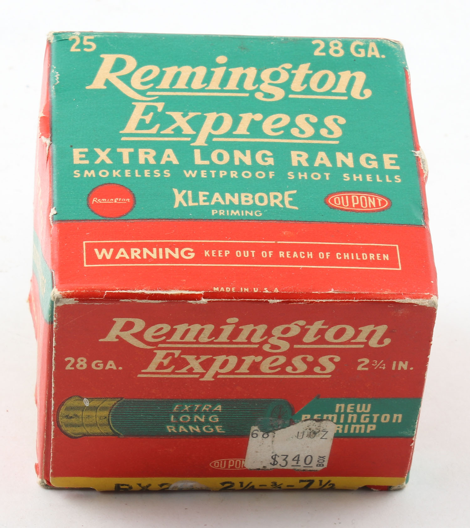 Remington Express, Extra Long Range, 28ga., 2 3/4'', 1pc., Full, shot size 7 1/2, box is white, yellow, red and green, box is very solid with edge wear & excellent color, paper shells are excellent. Grade: Excellent - Value: 10 to 40