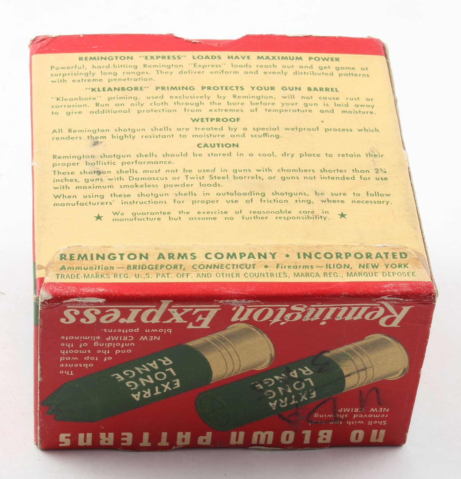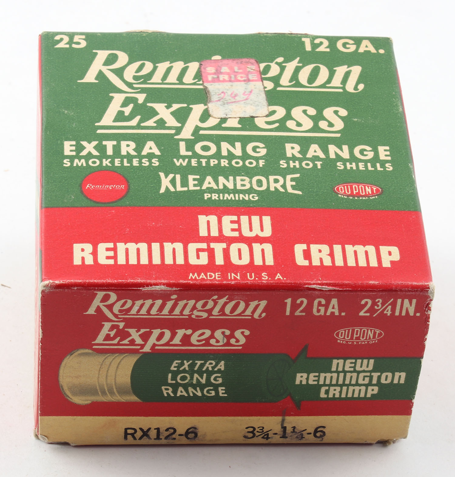 Remington Express, Extra Long Range, 12ga., 2 3/4'', 1pc., Full, shot size 6, box is red, white and green, box is very solid with great colors, paper shells are excellent. Grade: Excellent - Value: 10 to 30