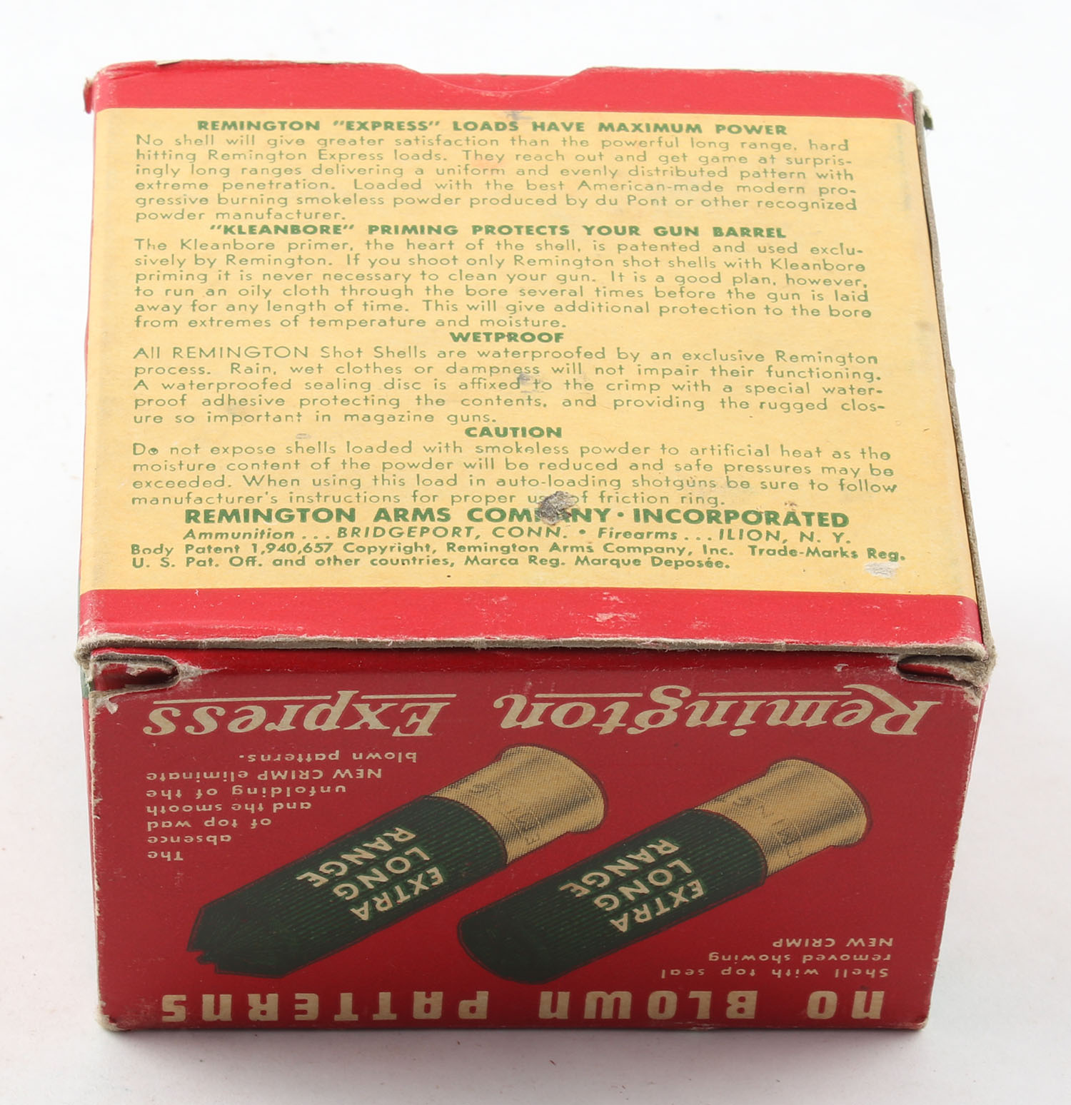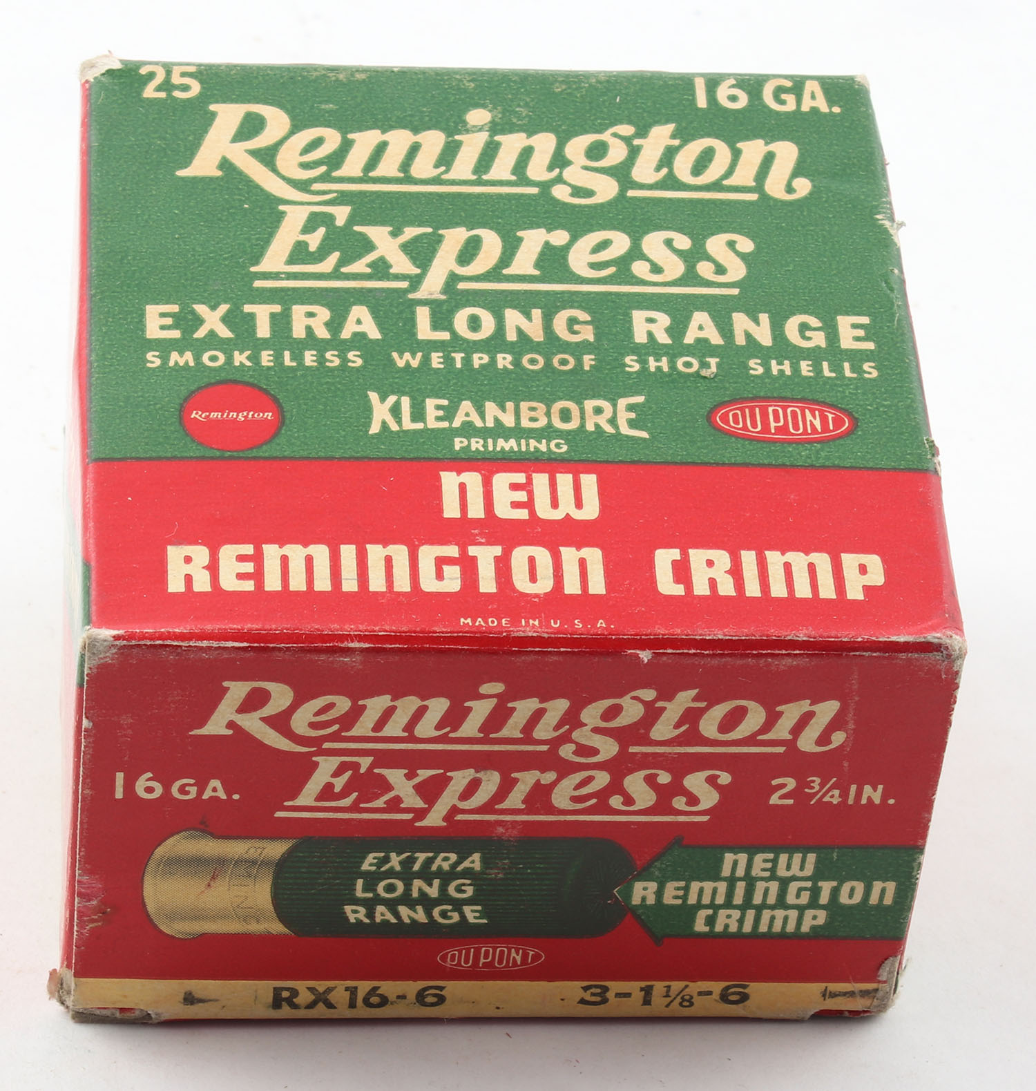 Remington Express, Extra Long Range, 16ga., 1pc., Full, shot size 6, 2 3/4'', red, white and green box, box has minor corner wear with excellent color, paper shells are excellent. Grade: Excellent - Value: 10 to 30