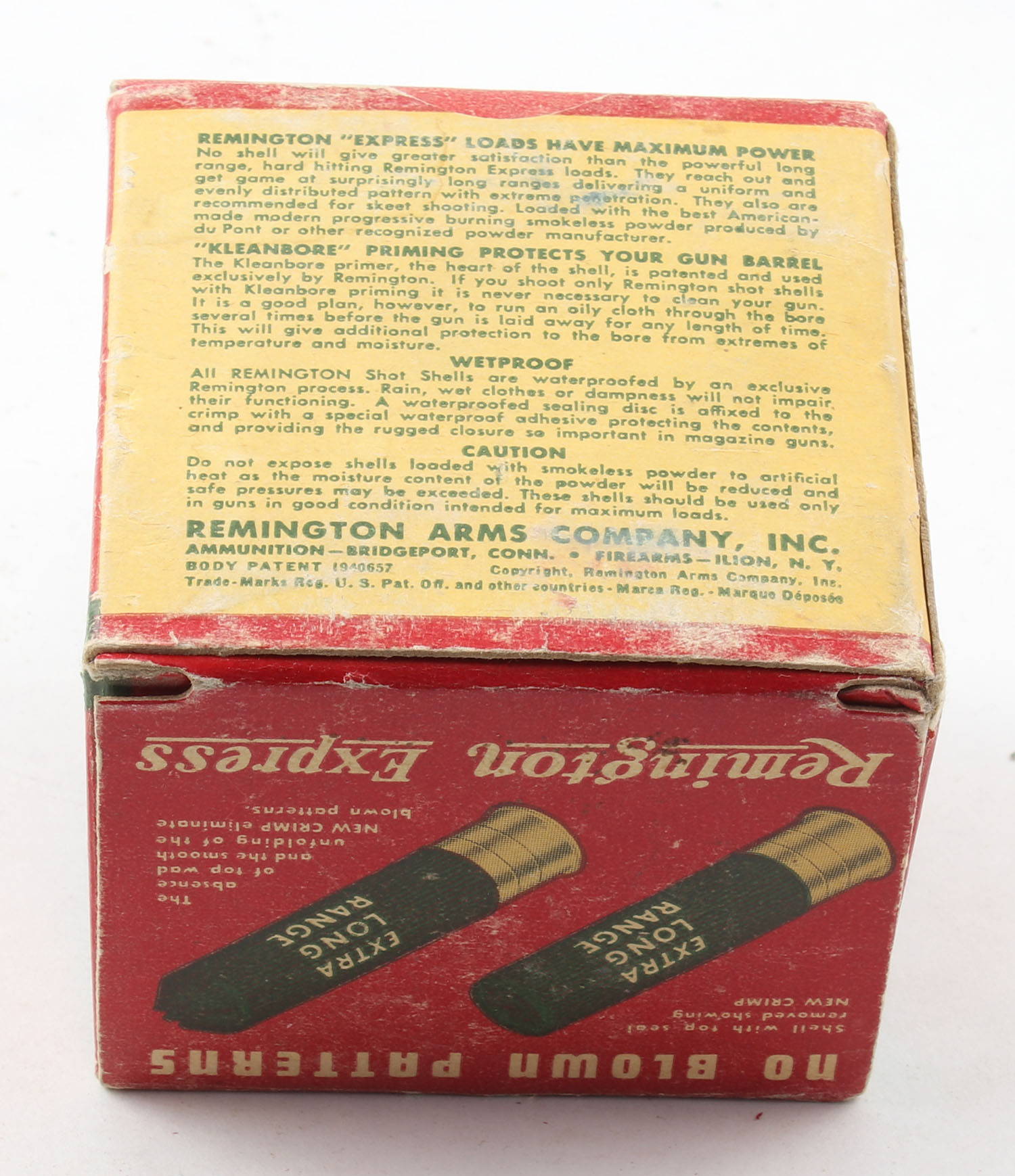 Remington Express, Extra Long Range, 28ga., 2 7/8'', 1pc., Full, shot size 6, box is white, yellow, red and green, box has age soiling & edge wear, paper shells are very good. Grade: Very Good + - Value: 10 to 40