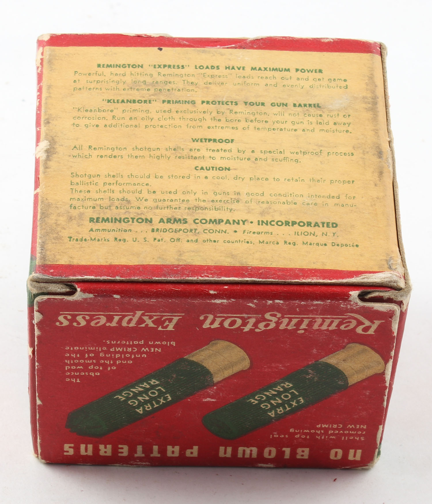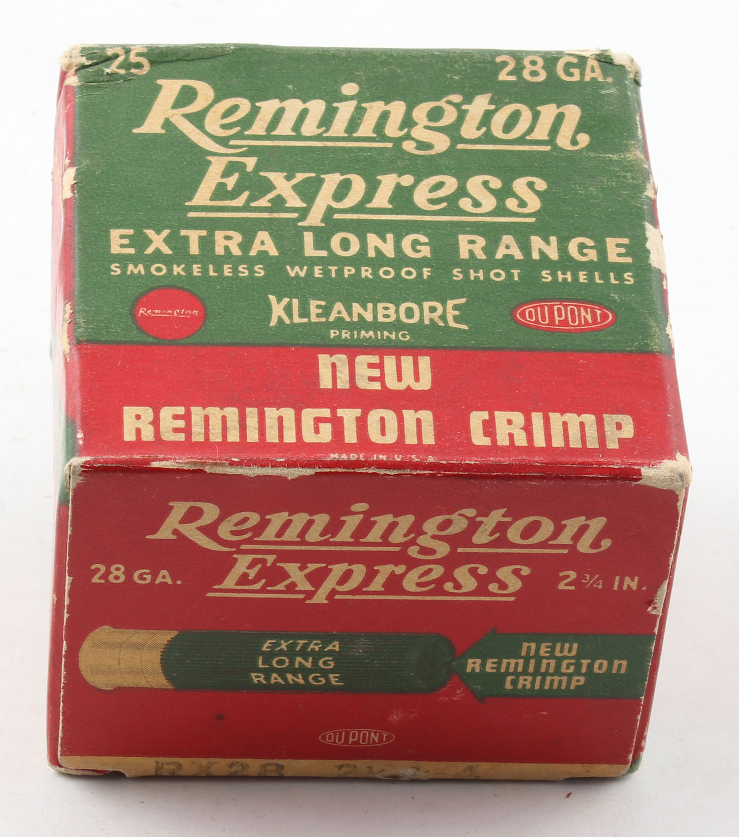 Remington Express, Extra Long Range, 28ga., 2 3/4'', 1pc., Full, shot size 4, red and green box, box has edge & corner wear with great colors, paper shells are excellent. Grade: Very Good + - Value: 10 to 40