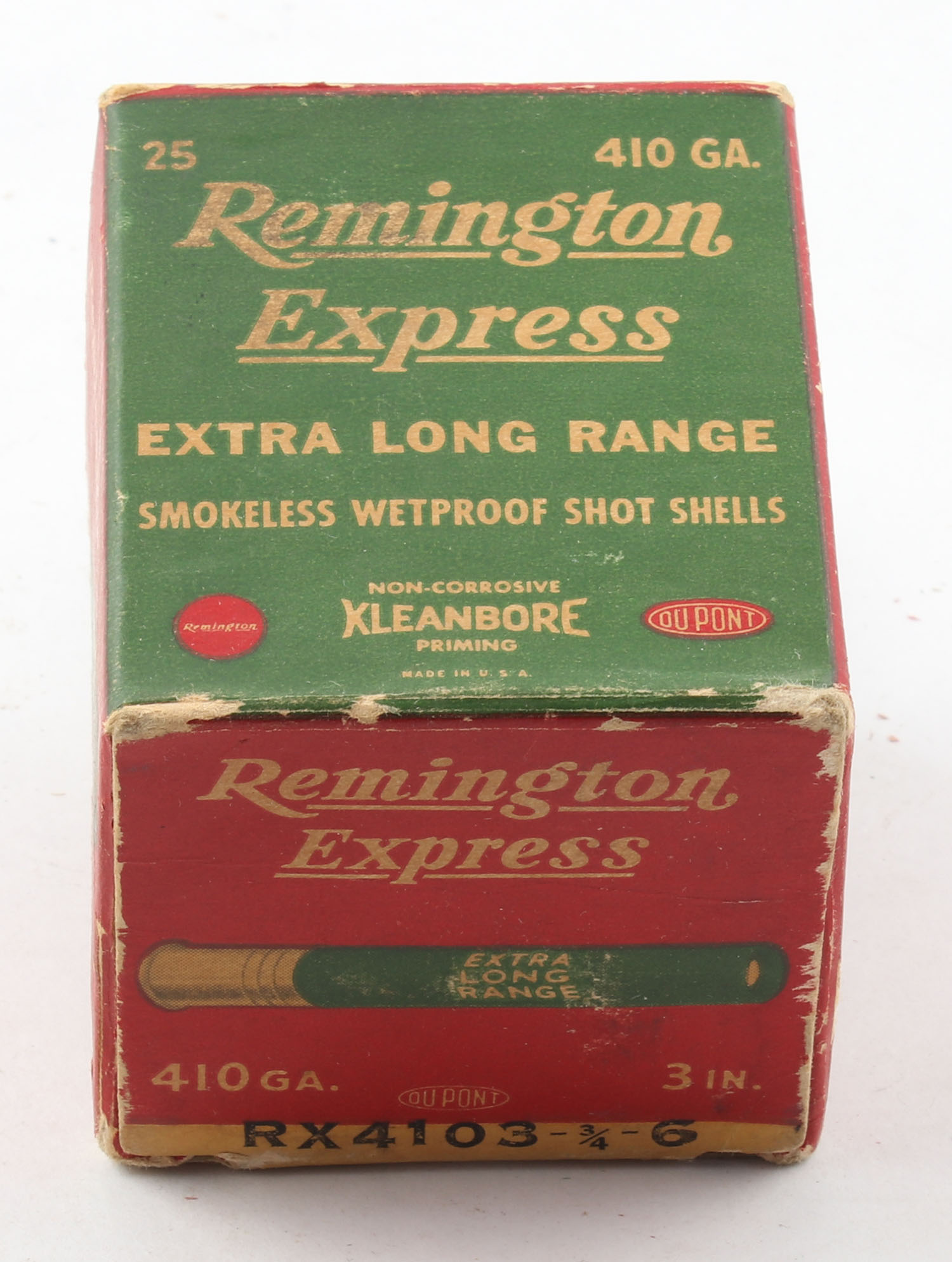 Remington Express, Extra Long Range, 410ga., 3'', 1pc., Full, shot size 6, box is white, yellow, red and green, box has light age soiling with edge wear, paper shells are excellent. Grade: Very Good - Value: 10 to 50