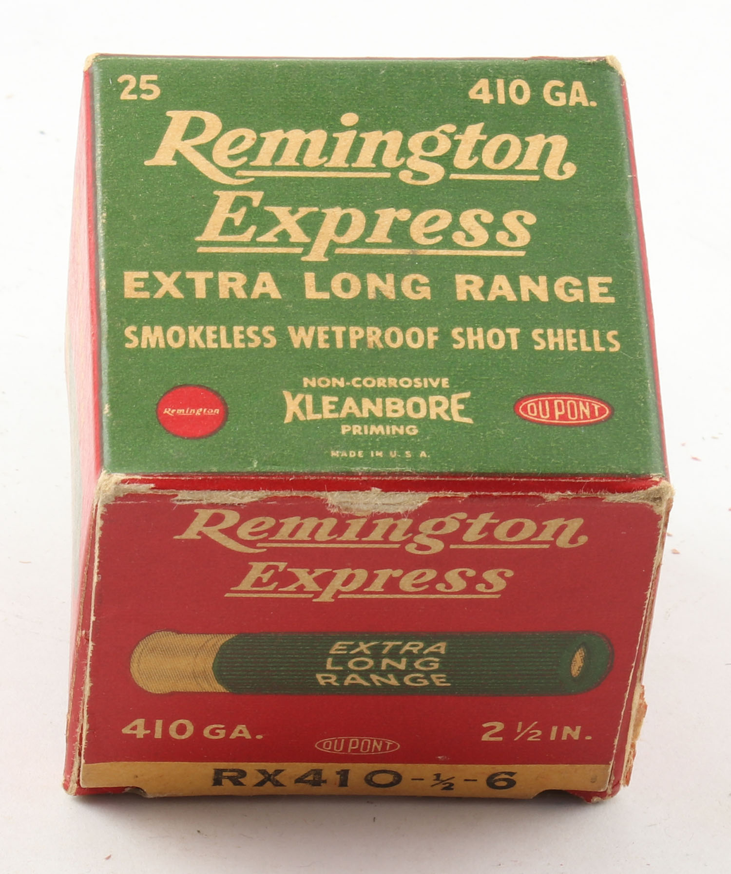 Remington Express, Extra Long Range, 410ga., 2 1/2'', 1pc., Full, shot size 6, box is white, yellow, red and green, box is solid with minor edge wear, paper shells are excellent. Grade: Excellent - Value: 10 to 50