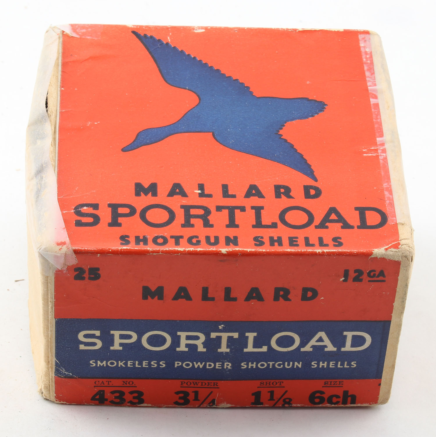 Sears, Sportload MALLARD, 12ga., 2pc., Full, shot size 6CH., red & blue box that pictures a Mallard in flight, box has two seam splits with tape repairs, has scuffing to bottom & edge wear, 50% of label is faded to yellow, paper shells are excellent. Grade: Good - Value: 20 to 100
