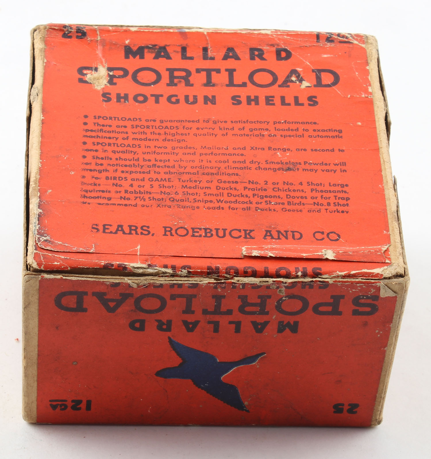 Sears, Sportload MALLARD, 12ga., 2pc., Empty, shot size 7 1/2CH., red & blue box that pictures a Mallard in flight, box has light edge & corner wear, label is intact with great colors. Grade: Very Good ++ - Value: 40 to 100
