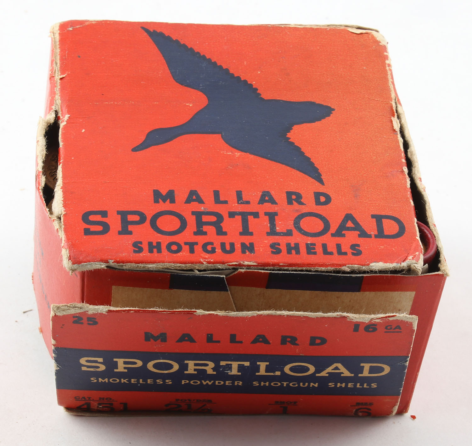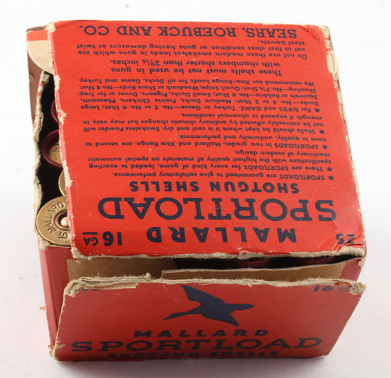 Sears, Sportload MALLARD, 16ga., 1pc., Full, shot size 6, red & blue box that pictures a Mallard in flight, box has seam splits, box has nice colors, paper shells are excellent. Grade: Good - Value: 10 to 40