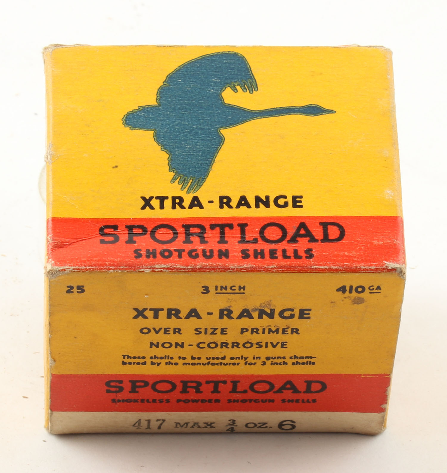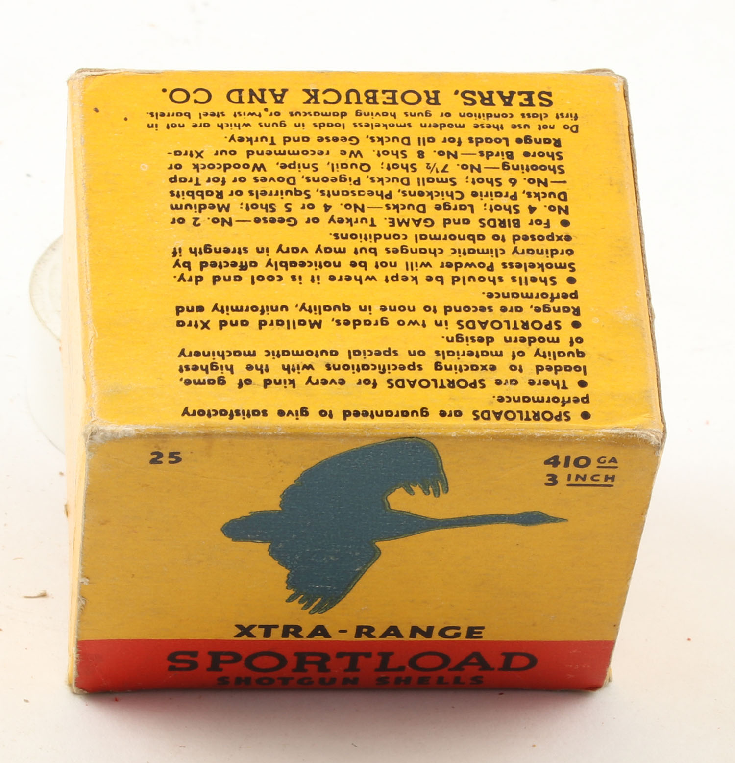 Sears Roebuck & Co., Sportload XTRA-RANGE, 410ga., 1pc., Full with 22rds. Being correct shot, 3'', shot size 6, yellow, blue & red box that pictures a Goose in flight, box is very solid with light scuffing & very nice colors, paper shells are excellent. Grade: Excellent - Value: 50 to 200