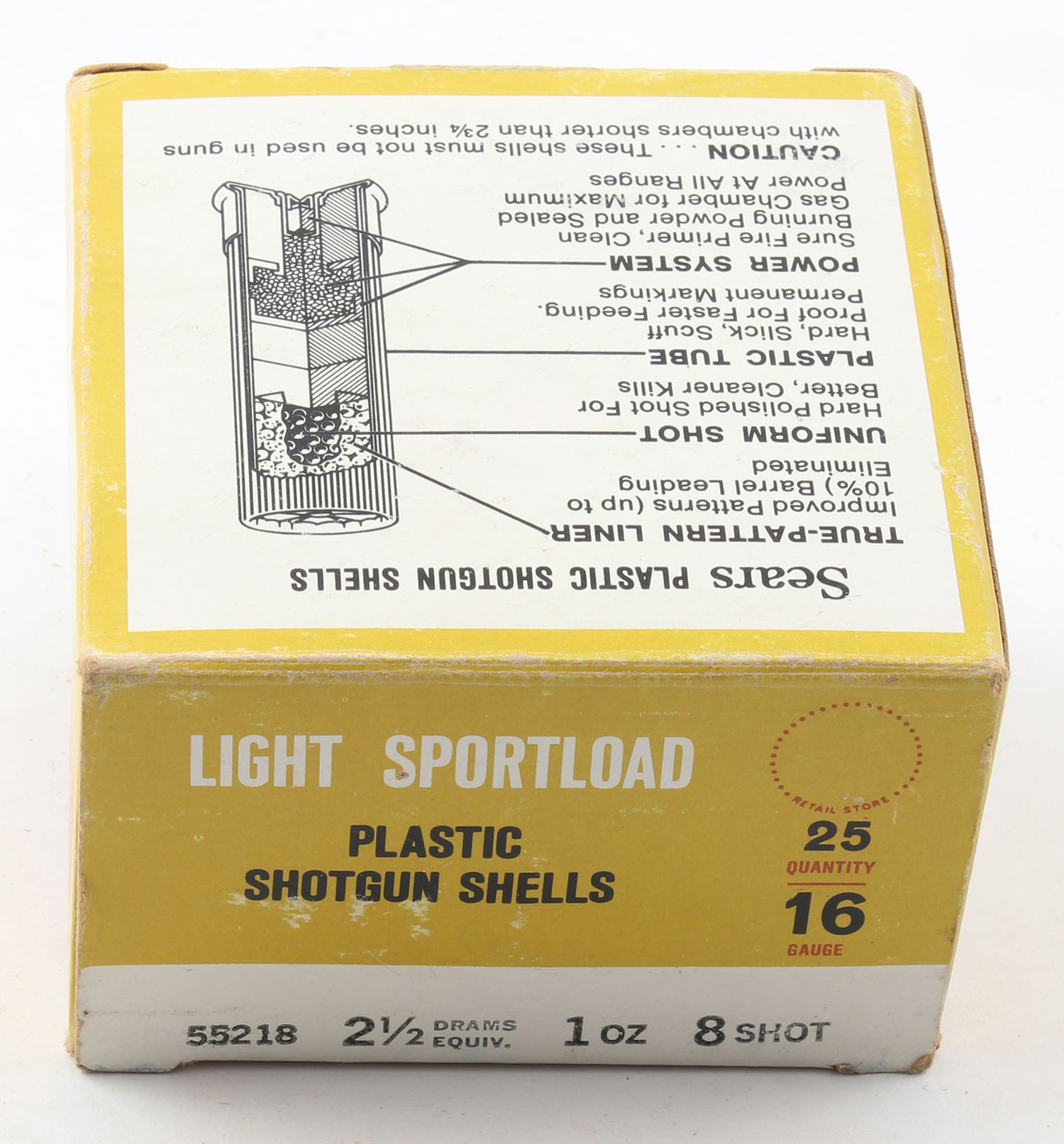Sears, Light Sportload, 16ga., 1pc., Full, shot size 8, multi-colored box, box is very solid with excellent colors, plastic shells are excellent. Grade: Excellent - Value: 10 to 30