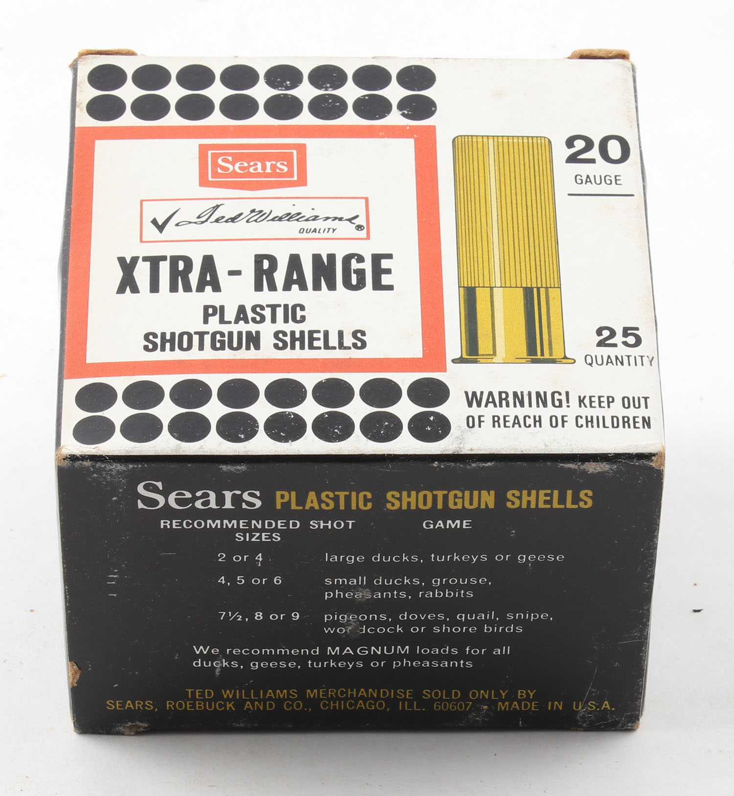 Sears, Xtra-Range, 20ga., 1pc., Full, Shot Size 6, multi-colored box, box is solid, plastic shells are excellent. Grade: Very Good ++ - Value: 10 to 30