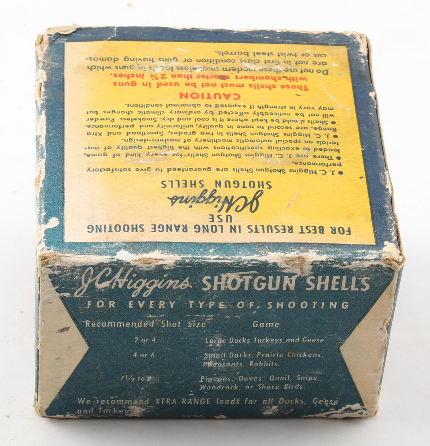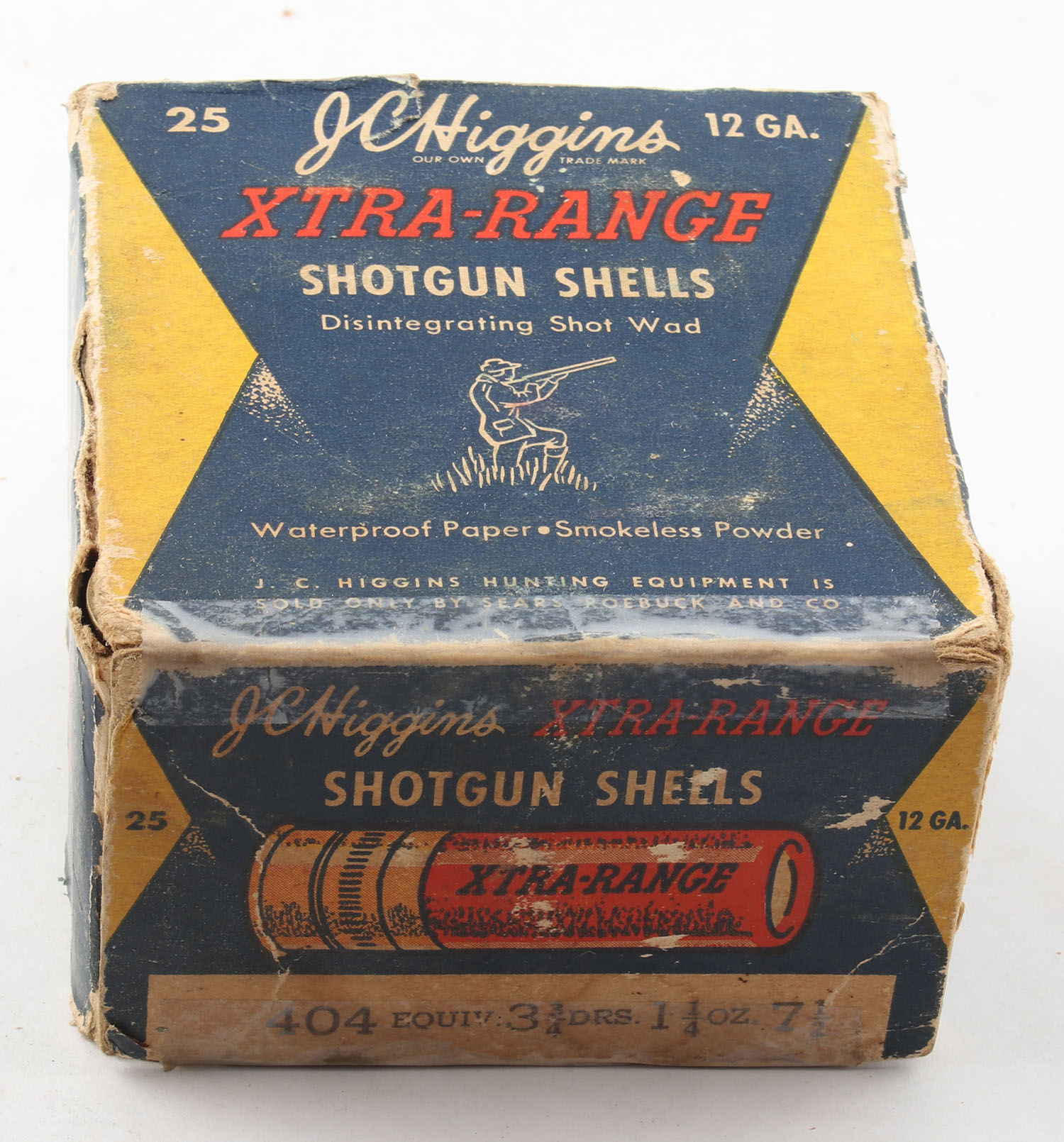Sears, J.C. Higgins, Xtra-Range, 12ga., 1pc., Full with 22rds. Being correct shot size, shot size 7 1/2, multi-colored box, box has age soiling, paper shells are very good. Grade: Good ++ - Value: 8 to 30