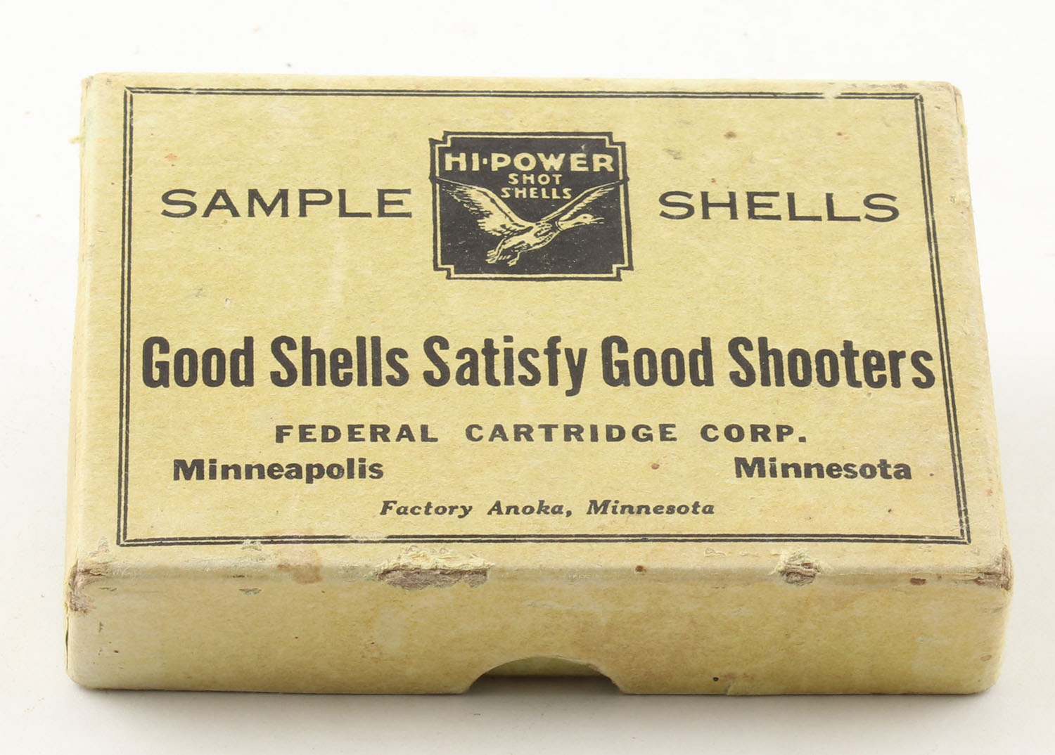 Federal, Hi-Power 5pc. Salesman sample set in green box, ''SAMPLE SHELLS'' on front with flying mallard logo, EMPTY, shows 5 steps of shotshell loading, box is very solid with good color. Grade: Very Good ++ - Value: 10 to 80