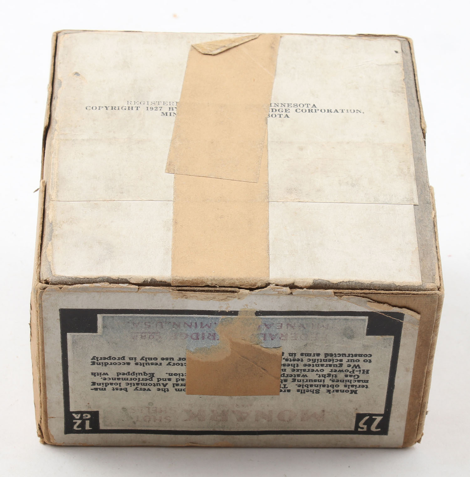 Federal Cart. Co., MONARK, 12ga., 2 PIECE!, Empty, shot size 6, buff box with black border & multi-colored label that pictures Mallard in flight, box has a seam split to top & bottom, box has good color. Grade: Very Good ++ - Value: 40 to 80