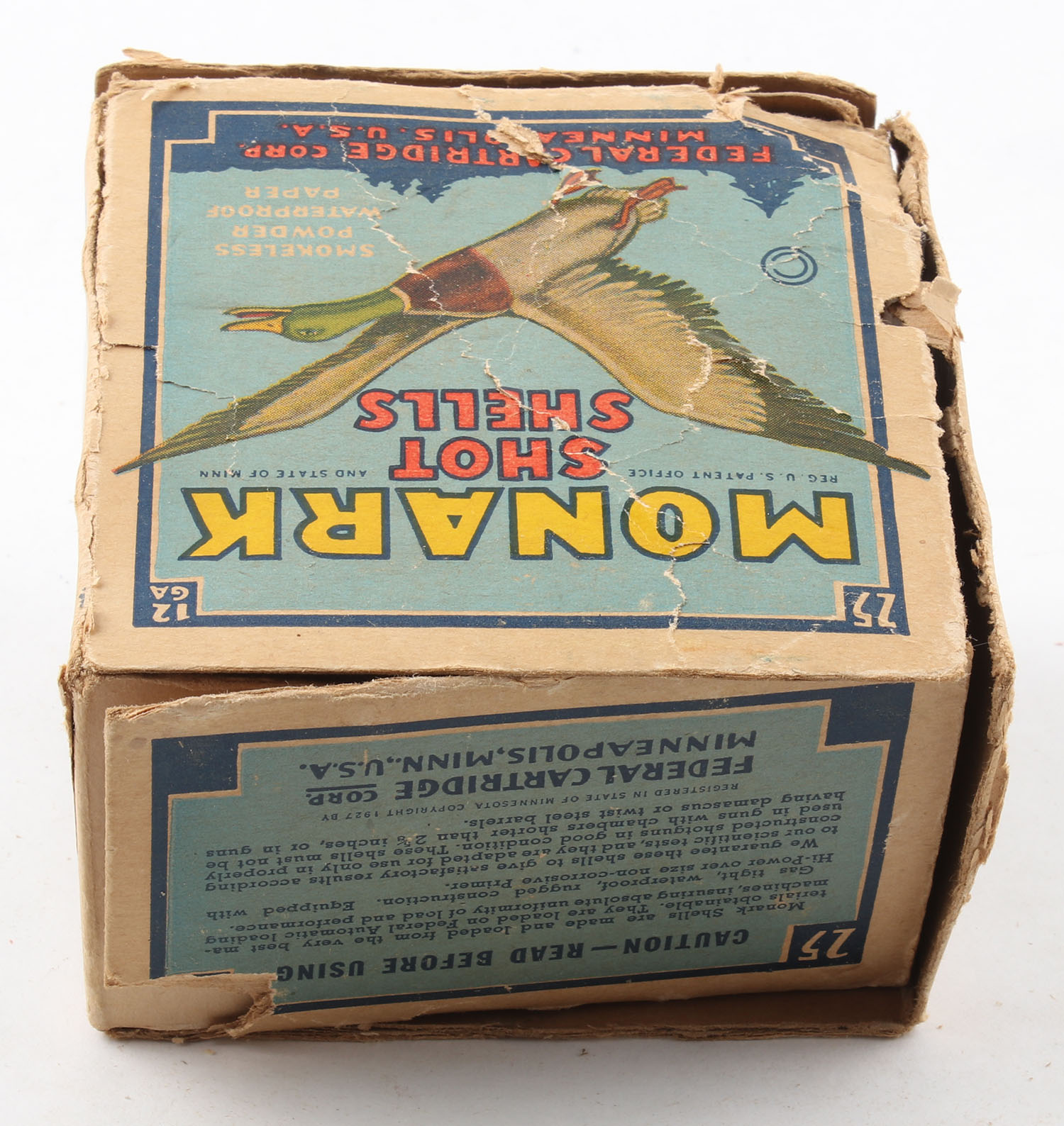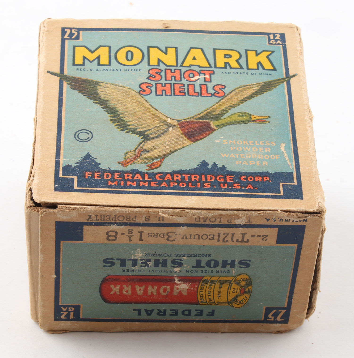 Federal, Cart. Co., MONARK, U.S. Property, 12ga., 1pc., Full, shot size 8 Trap Load, Blue border, blue, yellow and red box with flying mallard, box has age soiling with seam splits to top & bottom, paper shells are excellent. Grade: Good - Value: 10 to 40