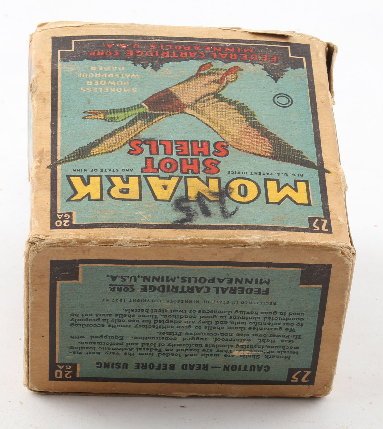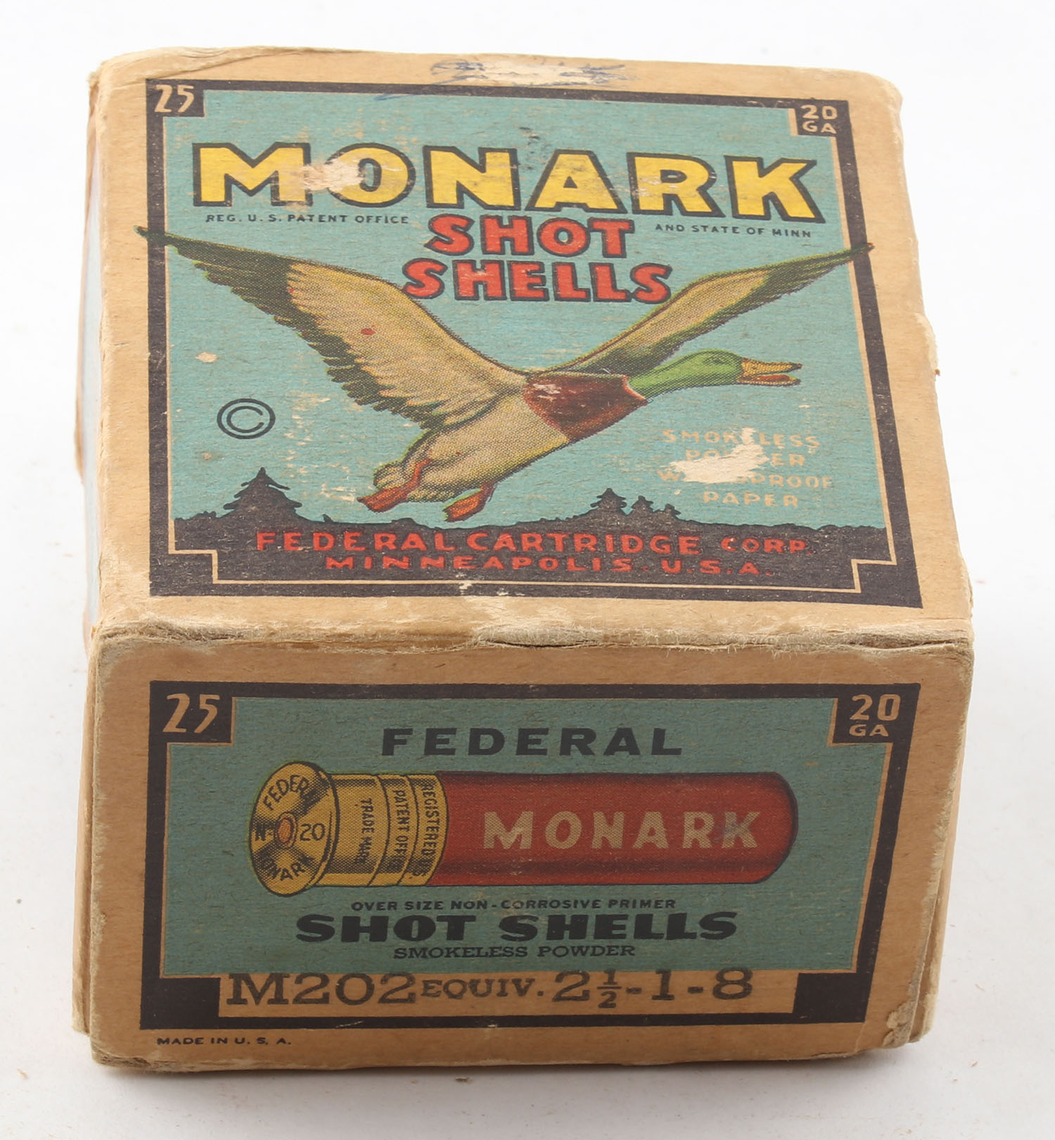 Federal Cart. Co., MONARK, 20ga., 1pc., Full, shot size 8, Black border, blue, yellow and red box with flying mallard, box has age soiling, edge & corner wear, paper shells are excellent. Grade: Very Good + - Value: 10 to 40
