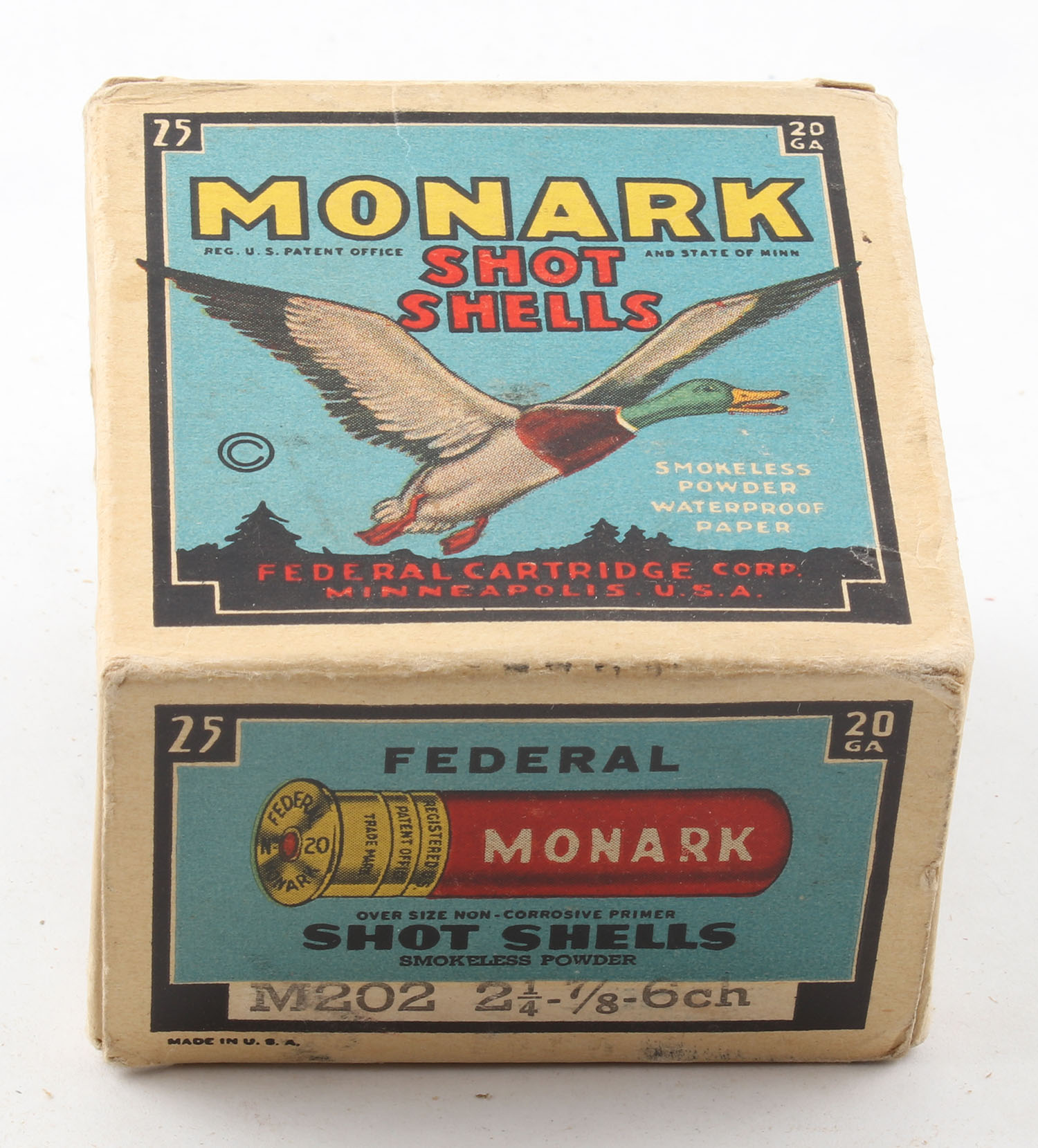 Federal Cart. Co., MONARK, 20ga., 1pc., Empty, shot size 6CH, Black border, blue, yellow and red box with flying mallard, box has light age soiling. Grade: Very Good ++ - Value: 10 to 40