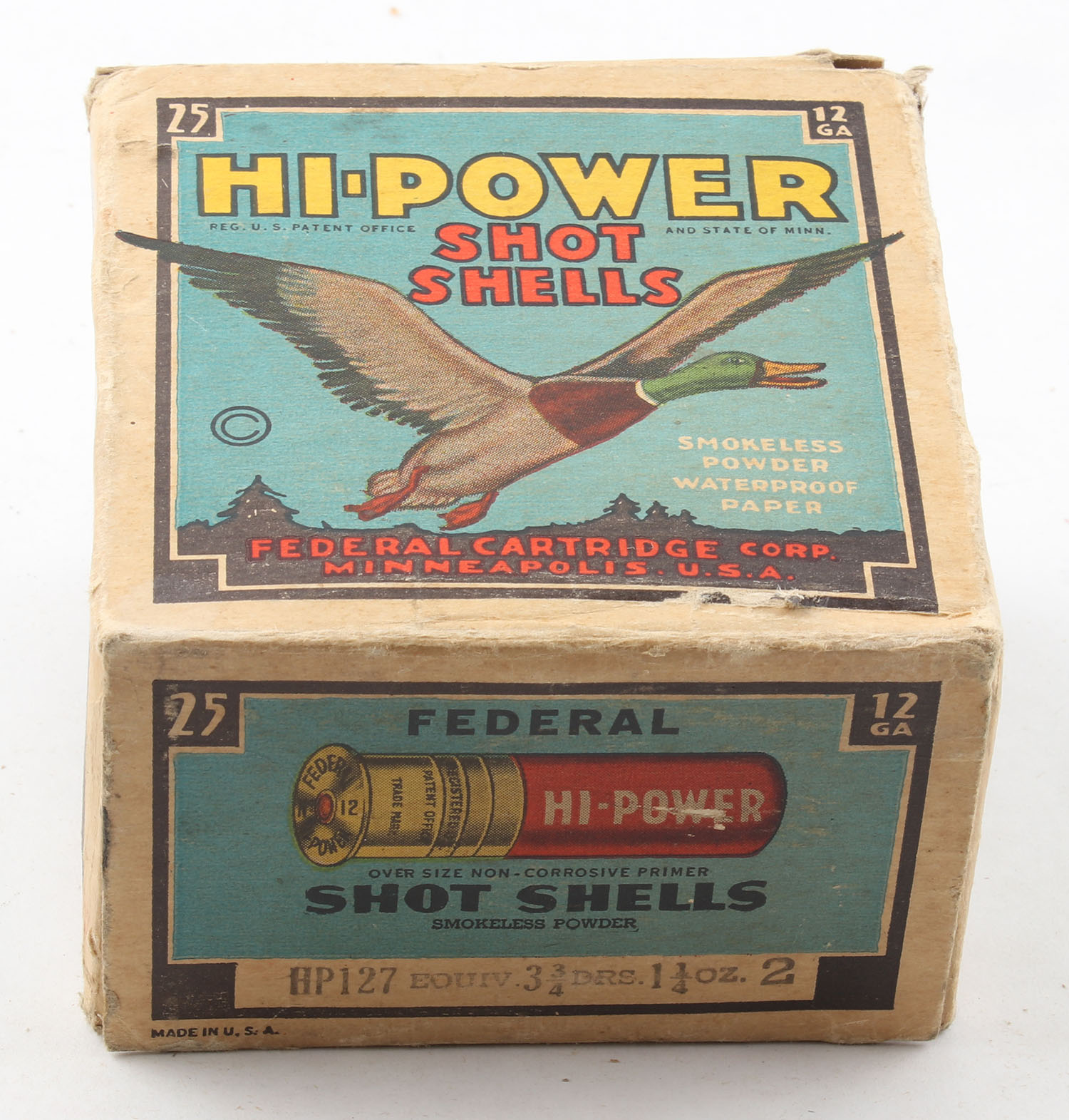 Federal Cart. Co., HI-POWER, 12ga., 1pc., Full with 13rds. Being correct, shot size 2, Black border, blue, yellow and red box with flying mallard, box has age soiling with edge & corner wear, paper shells are very good. Grade: Good ++ - Value: 10 to 40