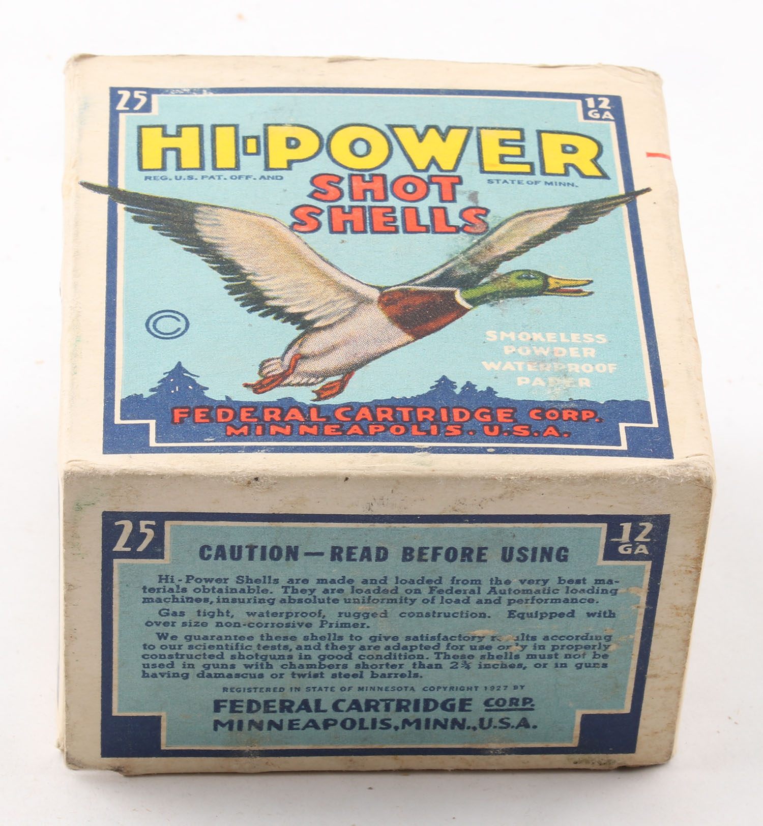 Federal Cart. Co., HI-POWER, 12ga., 1pc., Partial 24rds., shot size 4 Magnum, Blue border, blue, yellow and red box with flying mallard, box has age soiling with great colors, paper shells are excellent. Grade: Very Good ++ - Value: 10 to 40